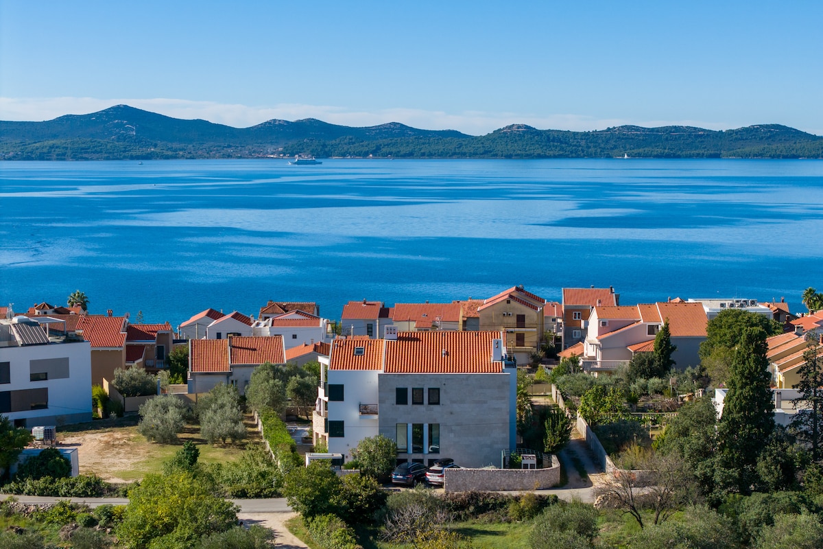 Villa Zadar Superior is a perfect place in Zadar, with the most beautiful sunset. Surround yourself with style in this new apartment, very well equipped, floor to ceiling windows with a breathtaking sea view and with your own roof deck area with exclusive private access. You can enjoy shared swimming pool and lounge areas in front of the house. Very nice pebble beach is near the house (150m).