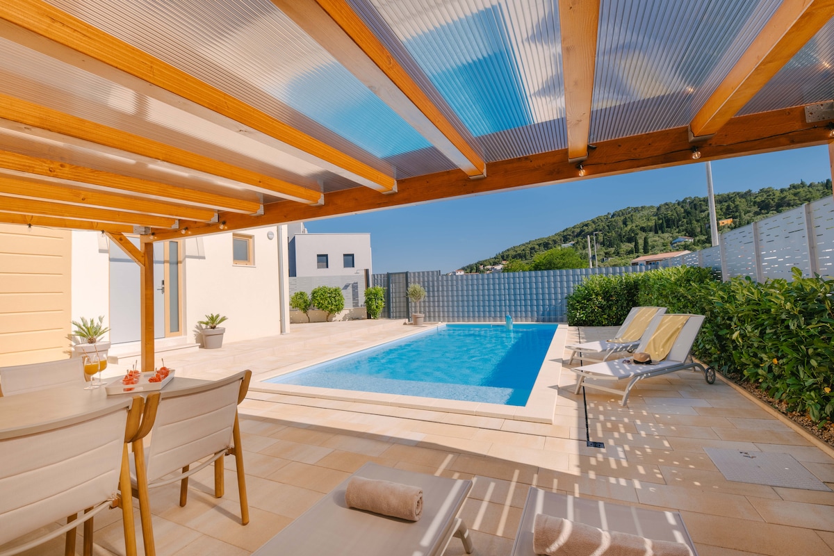 Newly renovated holiday home with a private pool and garden. The house is 80 m² with a 150 m² garden. It has two bedrooms, a kitchen with a dining area and living room, and a bathroom. The garden features a seasonal pool, a terrace with a dining table, a barbecue, sun loungers, and a solar shower. The pool and garden are for guests only, ensuring full privacy. Located 3 km from Zadar and 800 m from the sea and local beach.