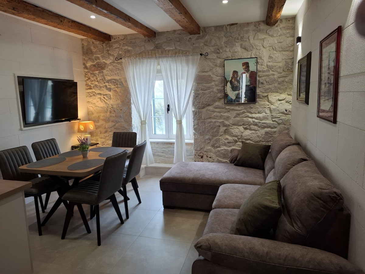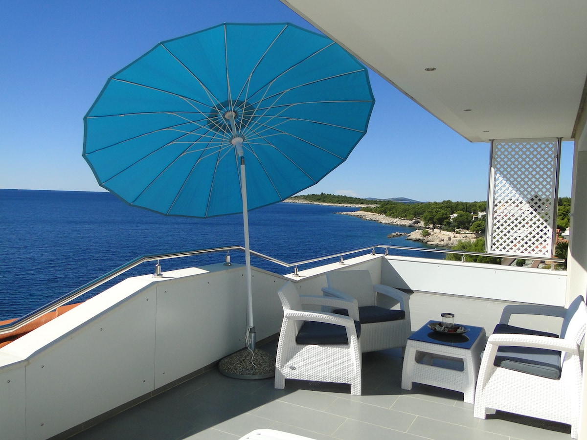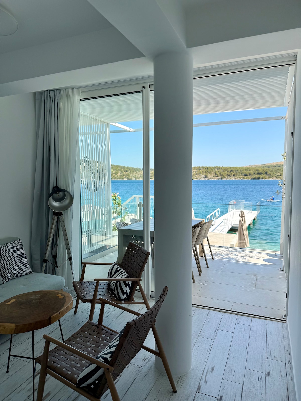 Exclusive 2 bedroom modern suite 2 meters from the beach. Suite is a part of Pearl House situated in small touristic place in the quite Adriatic bay. TV in each bedroom Fully equipped kitchen Air conditioning Bathroom with walk-in shower Swimming pool Wifi and free parking Bouy in the sea owned by the Pearl House in front of the Suite. Mooring can support the vessel up to 7m.For entering and exiting you can shortly dock by the pier in front of the Suite.