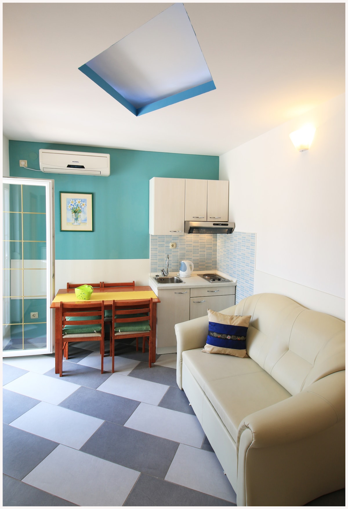 This is apartment in the center of Primosten, just by the beach with beautiful sea view. There is a bedroom with double bed, living room (with sofa bed for 2 people), kitchen with necessary equipment and dining area with big window with the view.