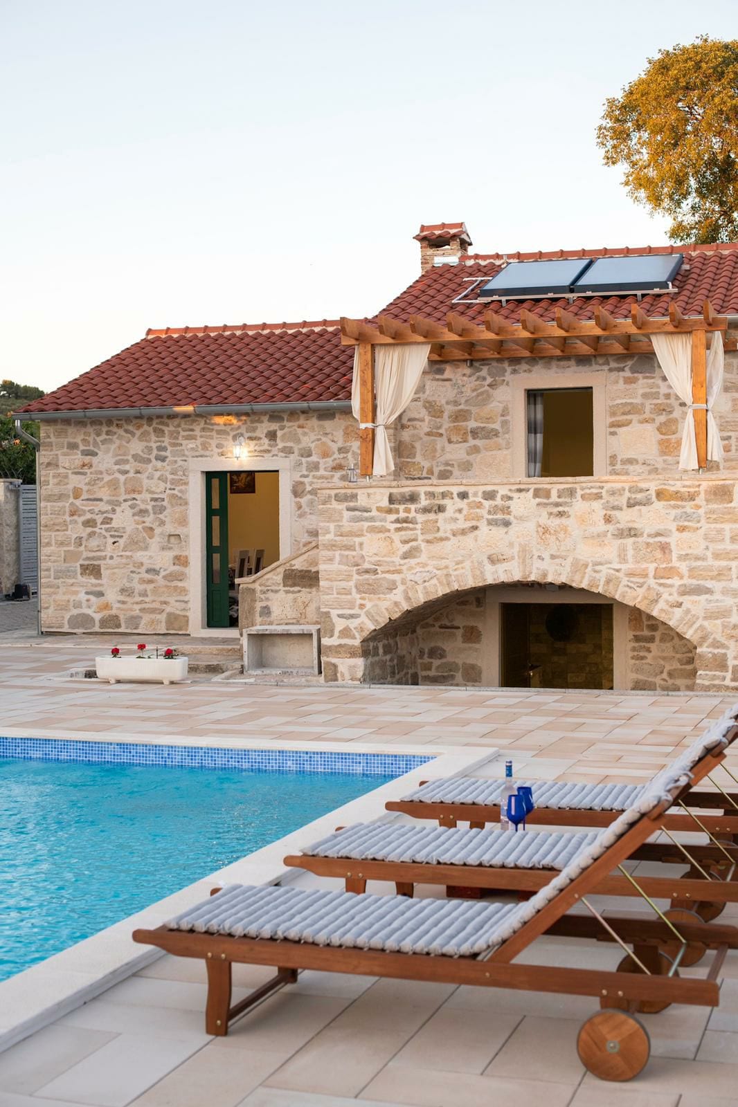 Kuča nudi smještaj za 8 do 10 ljudi sa privatnim bazenom,ležaljkama,muzikom, igralište za odbojku,badminton,vanjska kuhinja sa roštiljem,vanjski tuševi, park,trava..parking za aute u hladu,unutar objekta.Club-bar privatni u sredini smještaja samo za goste smještaja, te još mnogo opcija zabave!!