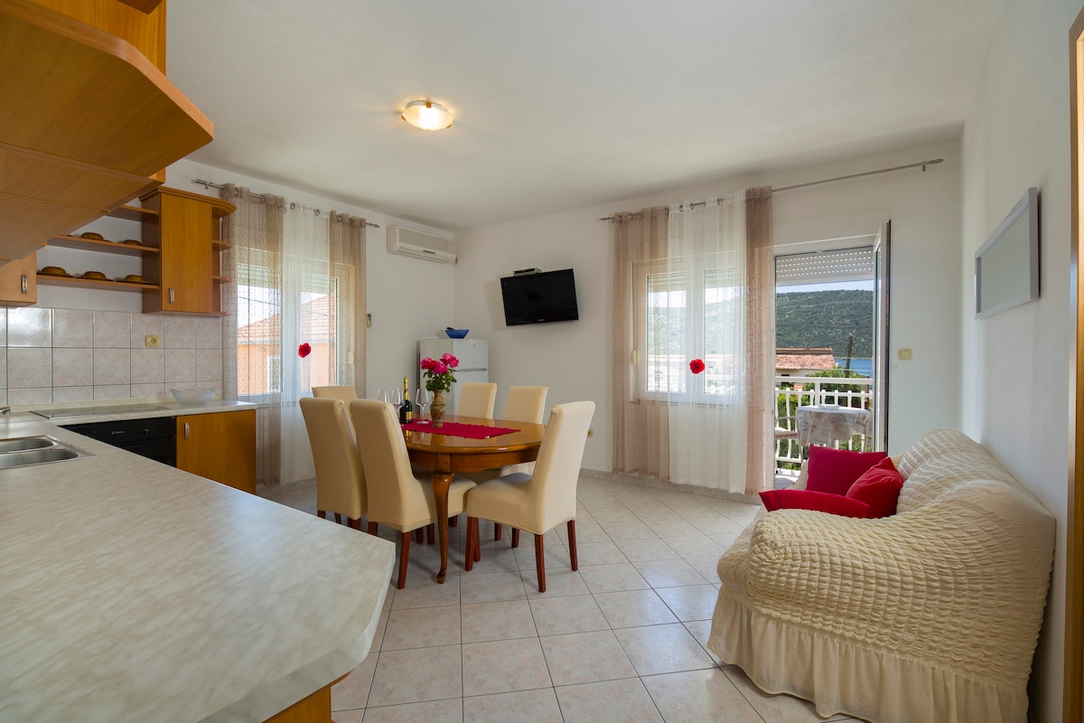 Apartman je moderno uređen,prostran,idealan za familiju koja želi mir.Terasa 30kvadrata ,.na njoj se nalazi sve sto trebate.Idealan pogled na more koje je udaljeno 10 m.Perilica ,veš mašina ,mikrovele ,frižider za duboko,i dr.gril.poseban ulaz.plaža betonska,šljunčana udaljena 50 m..lijepa i mirna uvala.more bistro kao dijamant.