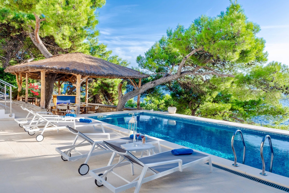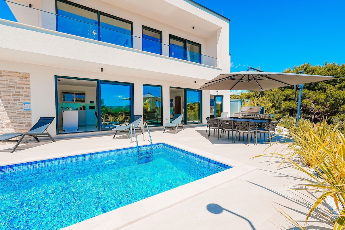Set on a peaceful hillside above Primošten, Misto II is a quiet retreat with space for 8 guests. Wake to sweeping Adriatic views from every bedroom, spend the day by your private heated saltwater pool, and share meals in the garden kitchen under the stars. With a relaxed open-plan layout, shaded terraces, and nature all around, it’s a place to slow down and enjoy time together.