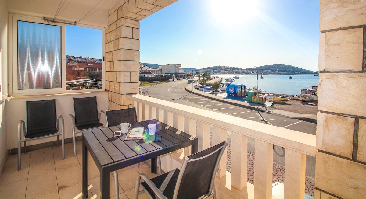 Studio apartment Karla & Stipe is located first row by the sea in Poljica, near Trogir (9km). In front of apartment you have beautiful beach where you can enjoy in summer. 1 double bedroom, couch, fully equipped kitchen, WC, large teracce with table, parking, WiFi, air-condition, TV/satellite. Above from aparment is market, 100 meter is bus station. In Poljica you have restaurant,caffe bar, playground for kids. Split is 36 km from here, airport Resnik (16km).