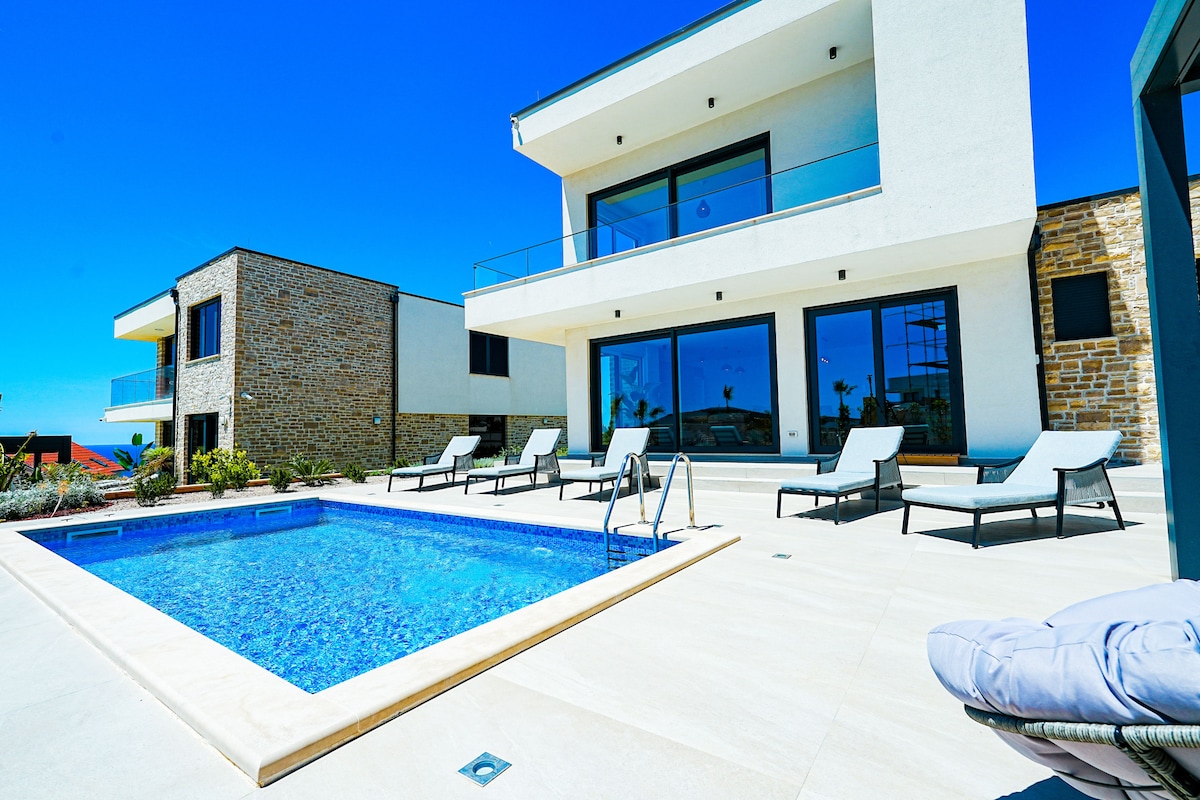 Die neuwertige Ferienvilla mit Swimming Pool in Primosten bietet jeglichen Komfort und erstreckt sich über zwei Etagen. Die Villa versprüht mediterranen Charme, durch die mit Stein verkleidete Fassade, vereint mit moderner und hochwertigen Inneneinrichtung. Das Anwesen ist in Südwest Ausrichtung und bietet einen atemberaubenden Panorama Weitblick auf das offene Meer und die Inselgruppe der Kornaten. Die Unterkunft befindet sich in ruhiger Lage.