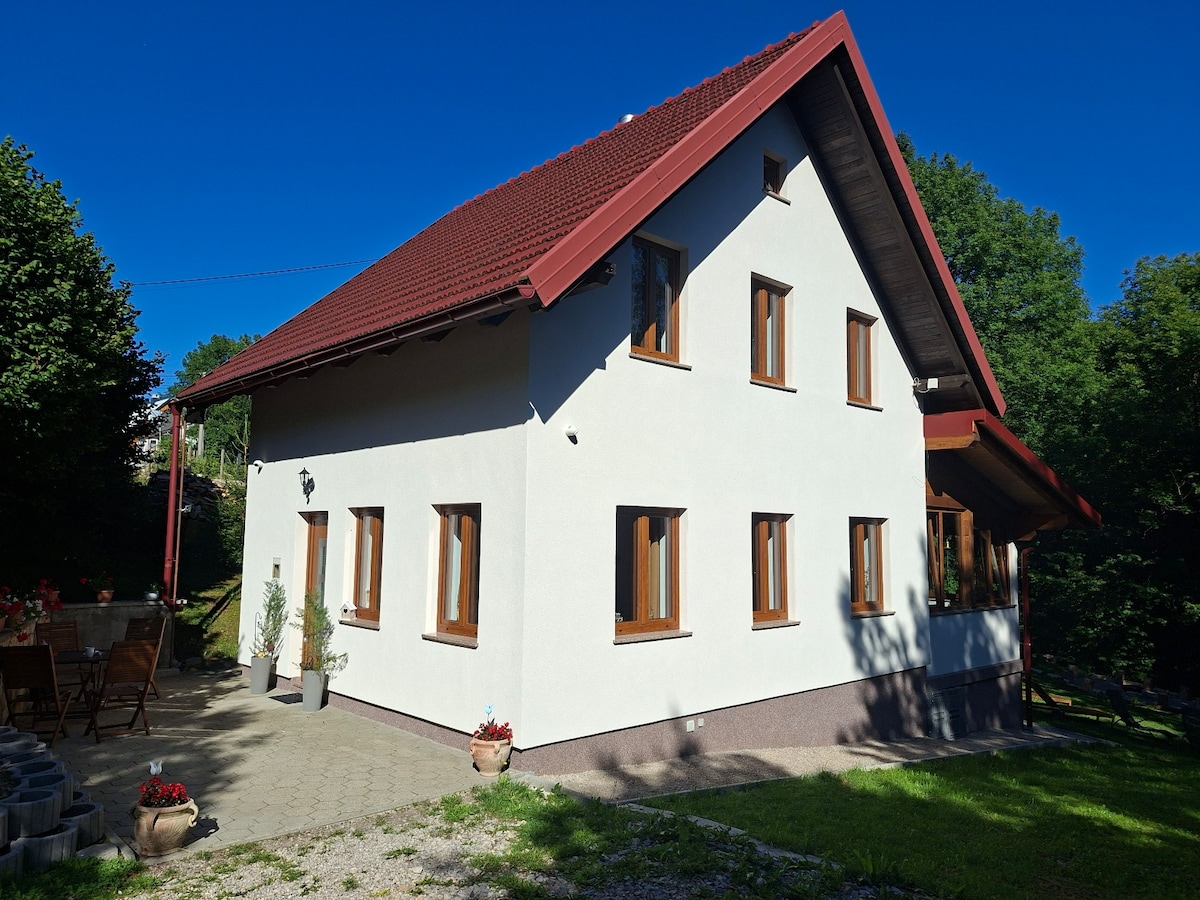 Surrounded by forest and greenery, this holiday home offers everything you need for a true escape from everyday life. A spacious terrace with a breathtaking view of surrounding mountains – is the perfect spot for a morning coffee or an evening soak in the jacuzzi under the stars. In winter, everything is covered in snow, and the ski and sledding slopes are just around the corner. Peace, fresh mountain air and silence rule here – ideal for recharging and enjoying the rhythm of nature.