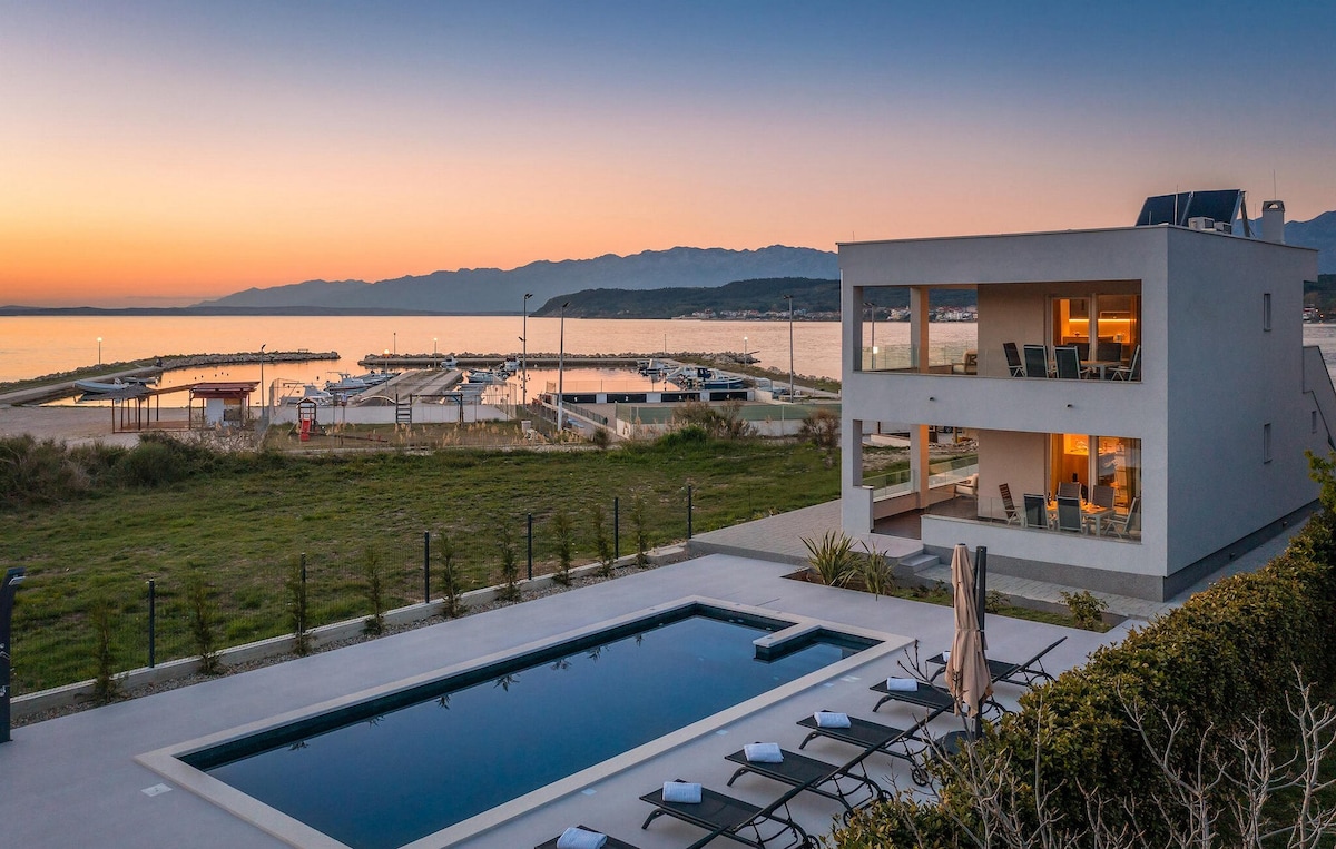 Villa Matak offers you unique accomodation in pitoresque village only 15 kilometers from beautiful city of Zadar. It has a spectacular view on the sea and the mountain of Velebit. Villa can accomodate 8 people in 4 bedrooms with 4 bathrooms on 1st floor. On the ground floor there is open space living room, dining room, fully equiped kitchen, gaming room with billiard and toillette. Nearest beach is 2 kilometers away. You can enjoy bike tours, visit national park Paklenica,island of Pag and more.