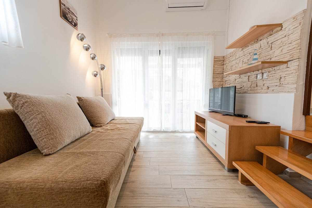 **New stone apartment near the sea with fantastic sea view**. Apartment 55m2 for 2 + 1guests . Spacious living room with sofa that becomes a double bed (smart TV, air conditioning)Kitchen (oven, dishwasher, coffee machine). 1. Bedroom (large double bed, wide wardrobe) with toilet (shower). The apartment has a private terrace (10m2) with amazing sea views. The terrace contains a table for 4 people.