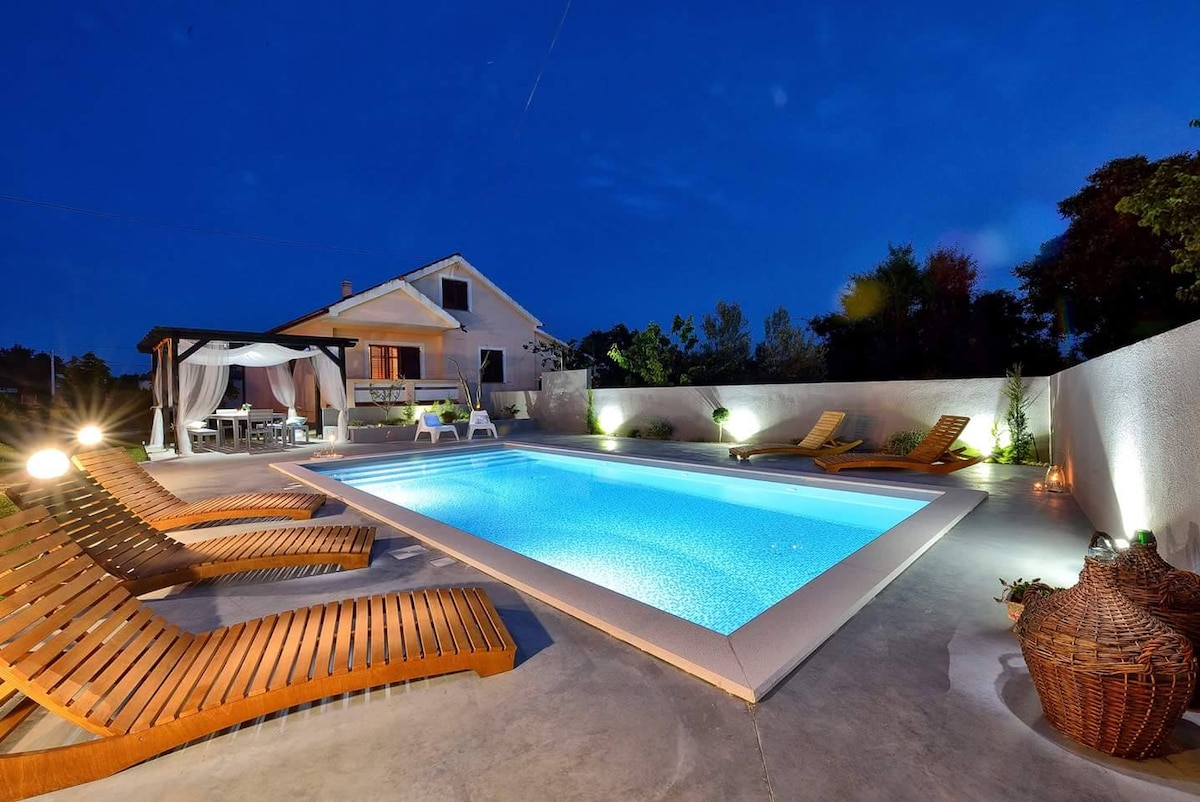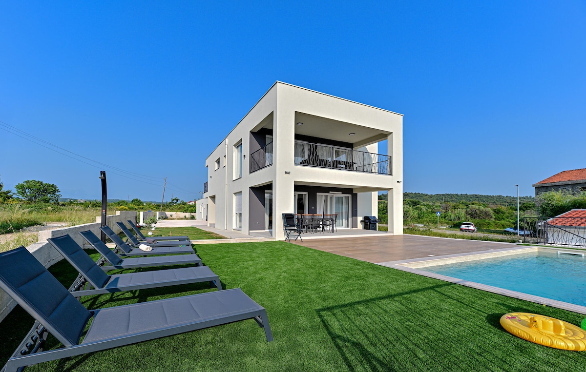 Lass Dich und deine ganze Familie von dieser modernen Luxusvilla mit einem atemberaubenden Blick aufs Meer verzaubern! Sie verfügt über einen 7x3m großen beheizten Pool, eine große Terrasse, eine charmante Grillhütte mit Bar-Theke, und eine Feuerstelle. Die Villa ist 17 km von der historischen Stadt Zadar entfernt. Sie entfaltet sich auf zwei Etagen: oben 4 komfortable Schlafzimmer, unten ein gemütlicher Wohnraum mit moderner Küche. Klimatisierte Räume, ruhige Umgebung, Nähe zum Sandstrand.