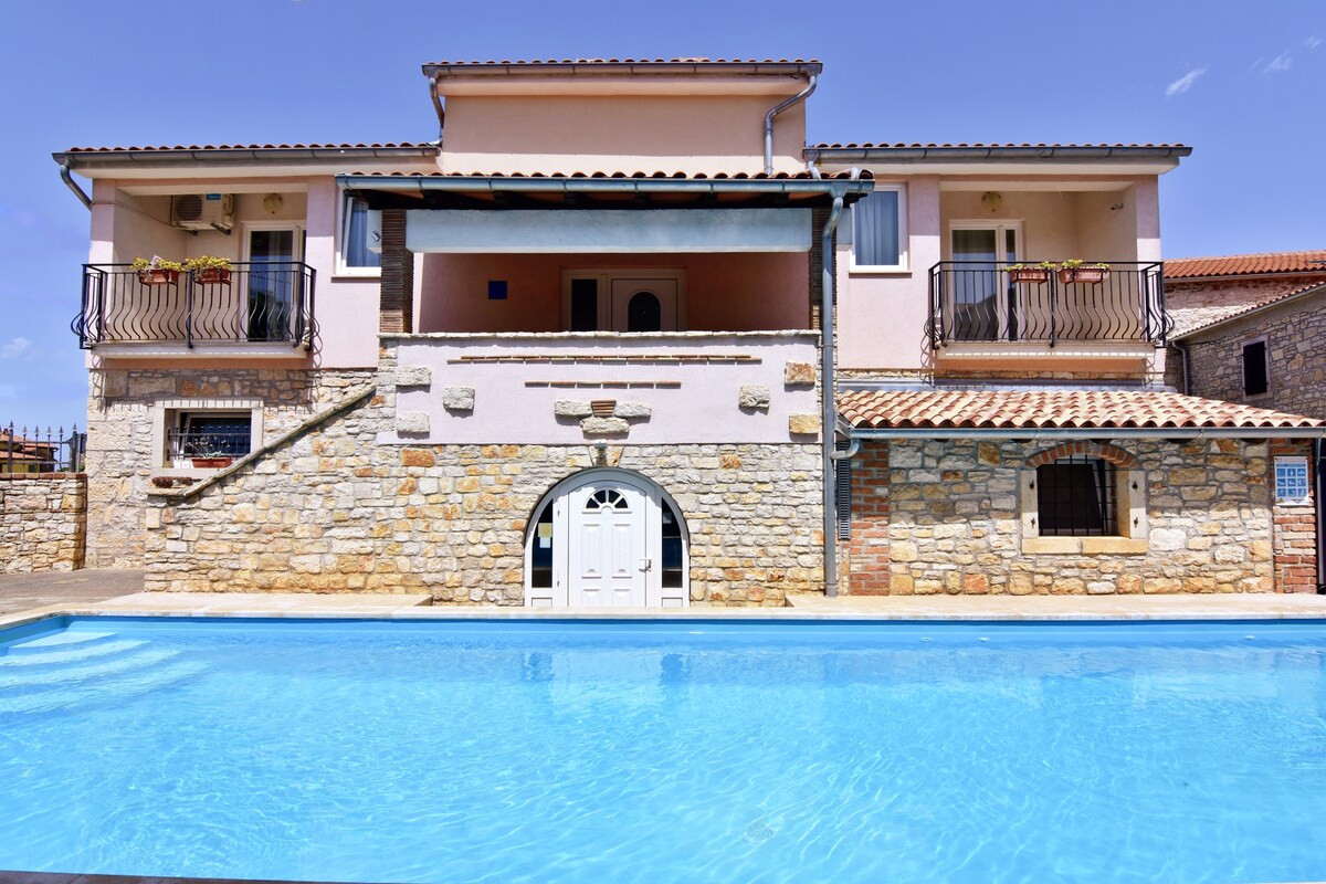 The comfortable apartment FIORELLA 1 is located in Tar, a small town 10 km from Poreč and 5 km from Novigrad. The apartment is located in a residence of 9 apartments located in three neighboring structures that together form the residence. In the residence, the swimming pool, deck chairs, umbrellas, outdoor shower, barbecue, table with Istrian stone benches, the games room with pool table, games, table football, flat-screen TV, sofas, and armchairs are available for shared use.