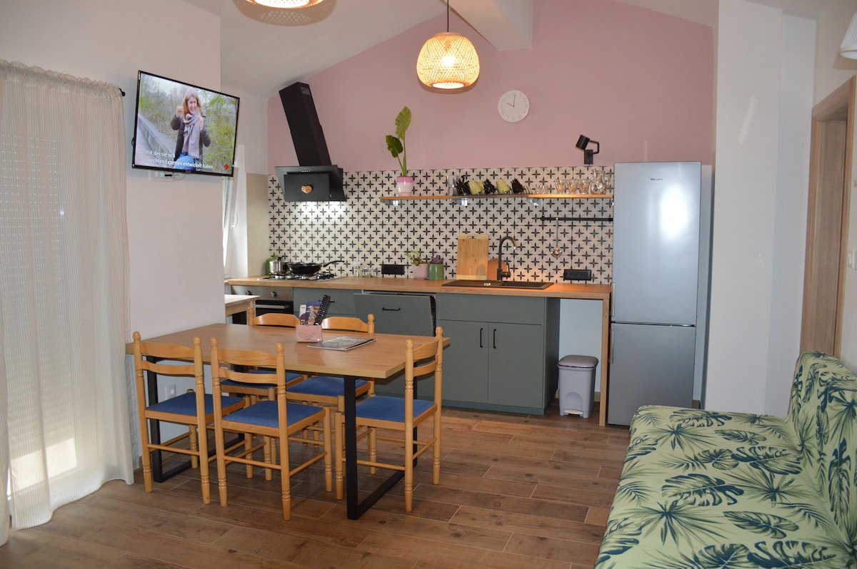The only apartment in our house with full privacy. It's a newly renovated and fully equipped two bedroom apartment with a modern open-space design with a unique high wooden ceiling. The parking is free and located in front of your apartment. The apartment has 80 m2 which will ensure a very comfortable stay. It's located in a typical quiet Istrian village only 5 minutes drive from the beach and 5 minutes from the famous Aquapark Istralandia. The Quattro Terre MTB trail goes through the village.