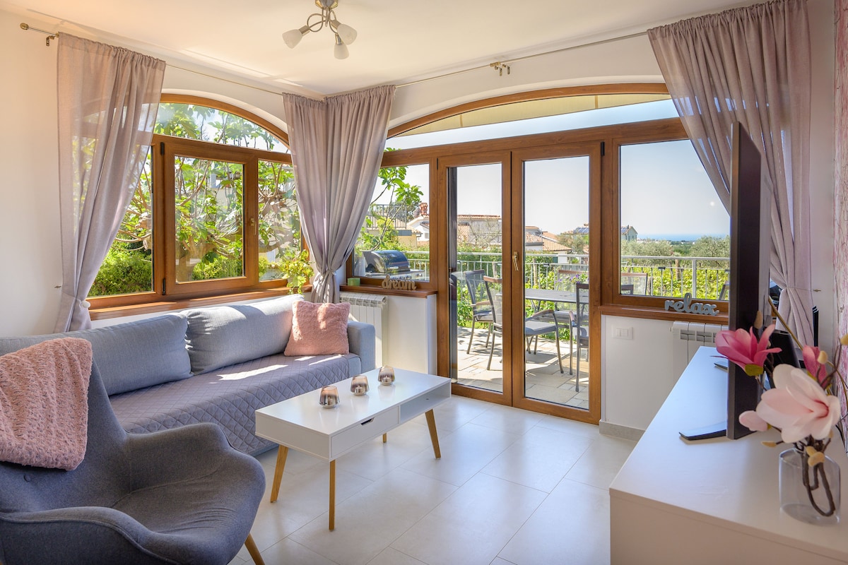 Forget the stress and hectic lifestyle in our little quiet place. You will enjoy a glass of good wine on the terrace with a beautiful sunset, sea views and vineyards and olive groves that surround us. Stylishly equipped apartment with two bedrooms, fully equipped kitchen with dining area, bathroom with washing machine, living room with exit to the terrace. Complete comfort for 4 people. A heated massage pool is located on the terrace. Large fenced yard with private parking.