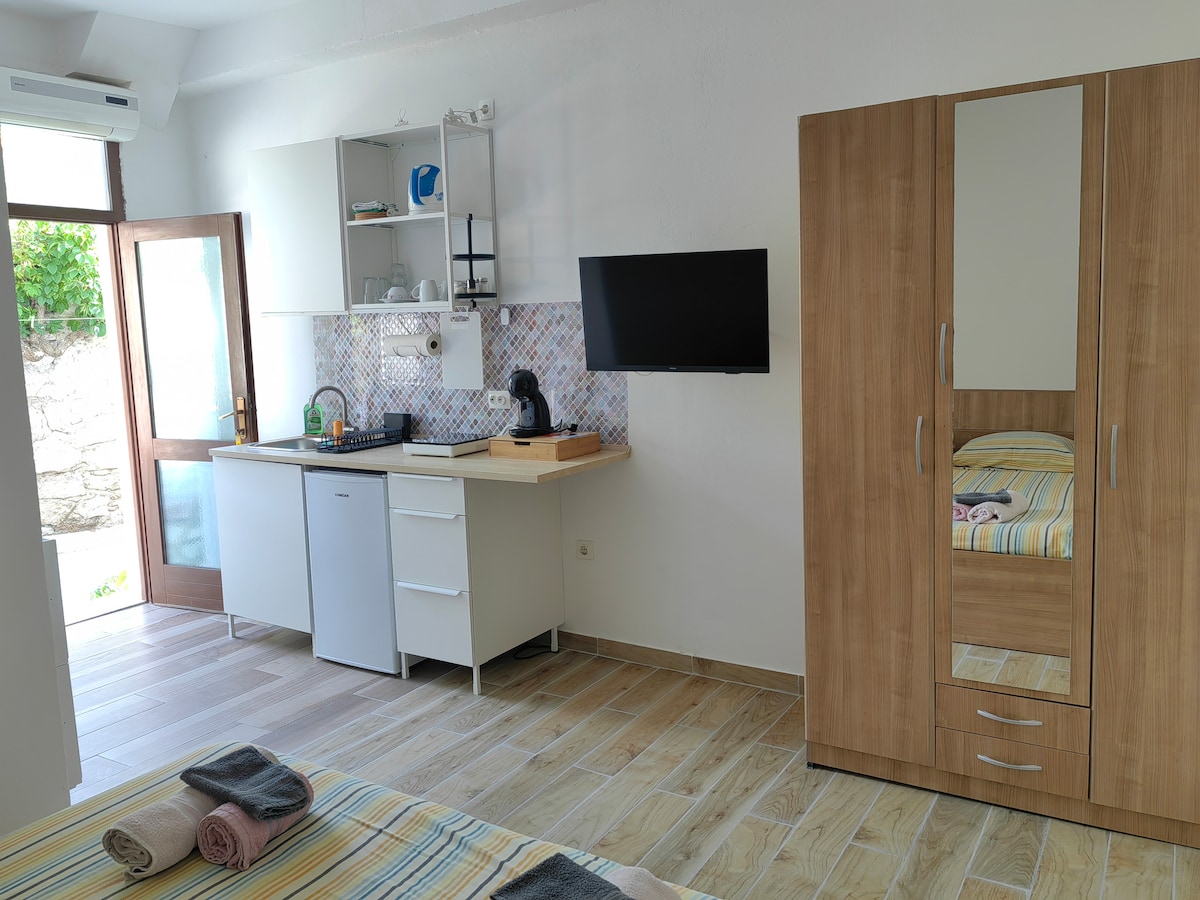 Studio je smješten na prvom katu kuće na samoj plaži. Ima pogled na vrt i ulicu. Klimatiziran je i ugodan za boravak dviju osoba. Do plaže se dolazi stepenicama iz dvorišta.