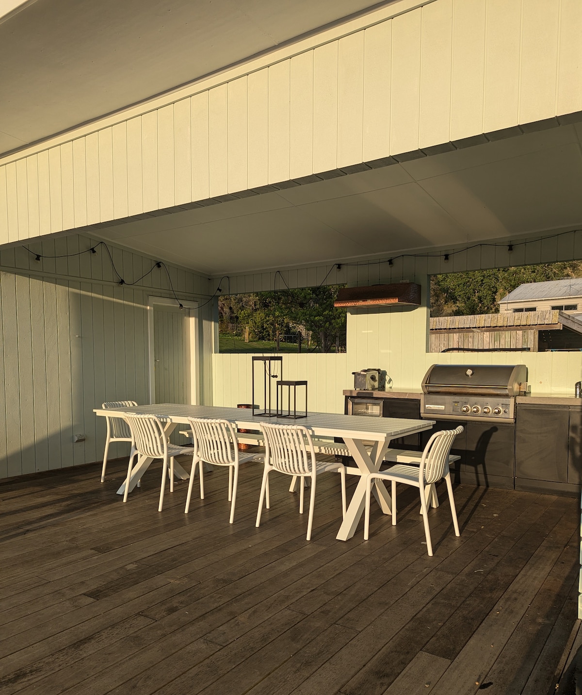 Give yourself a beach holiday like no other. An elevated site, nestled in the trees. You will wake to bird song and a full unobscured view of the beach. The property features 3 rooms with beach views, a very large open living area and expansive deck perfect for a BBQ. The house is naturally sheltered from the predominant westerly wind meaning you can make the most of the outdoor space. The beach is only a 5 minute walk away and the stream provides safe swimming areas for children.
