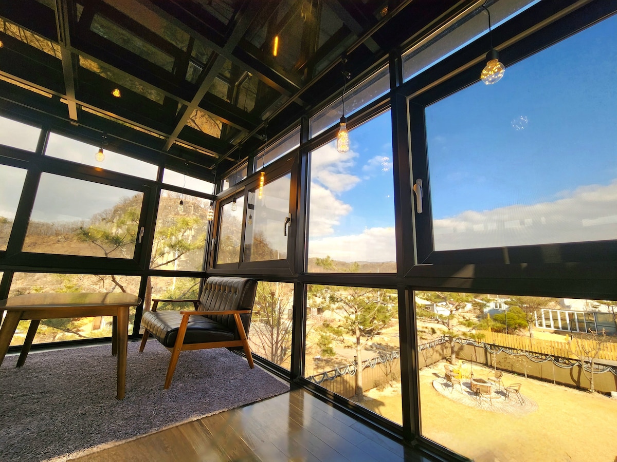 계절에 따라 색과 향기를 달리하는 정원에서 자연을 맘껏 느끼며 특별한 하루를 보내실수 있습니다. 그 어떤 카페보다 우아하고 멋스러운 공간에서, 마샬 스피커에서 흘러나오는 음악을 듣고,폴딩 도어 밖으로 펼쳐지는 자연을 바라보며 커피와 차 한잔에 여유를 즐기실수 있습니다. 설레이는 기분을 안겨줄 복층 구조의 2층 침실은 마치 산장에 놀러온 것만 같은 분위기를 선사합니다, 전원주택 한채와 정원을 오롯이 모두 제공합니다.