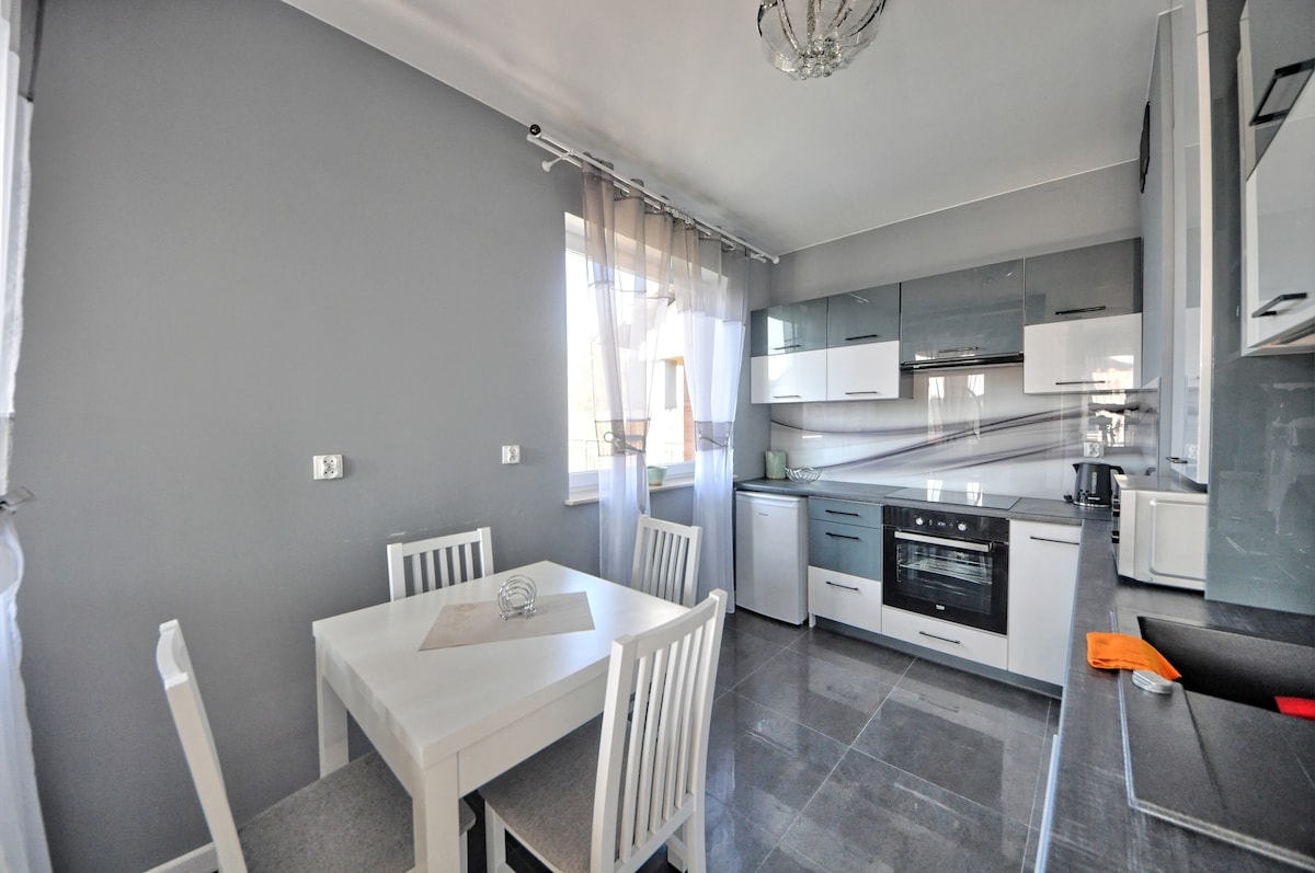 Przestronny, (50m2) elegancki apartament na spokojnym osiedlu, oddalonym od zgiełku miasta. W skład apartamentu wchodzi jasny, duży salon z aneksem kuchennym i balkonem, sypialnia i łazienka. W aneksie - płyta elektryczna, piekarnik, zmywarka. W salonie rozkładana sofa, tv, stół i krzesła. W sypialni łoże małżeńskie. W łazience kabina prysznicowa. Wi-fi w cenie. Śpiew ptaków o poranku - gratis :-)