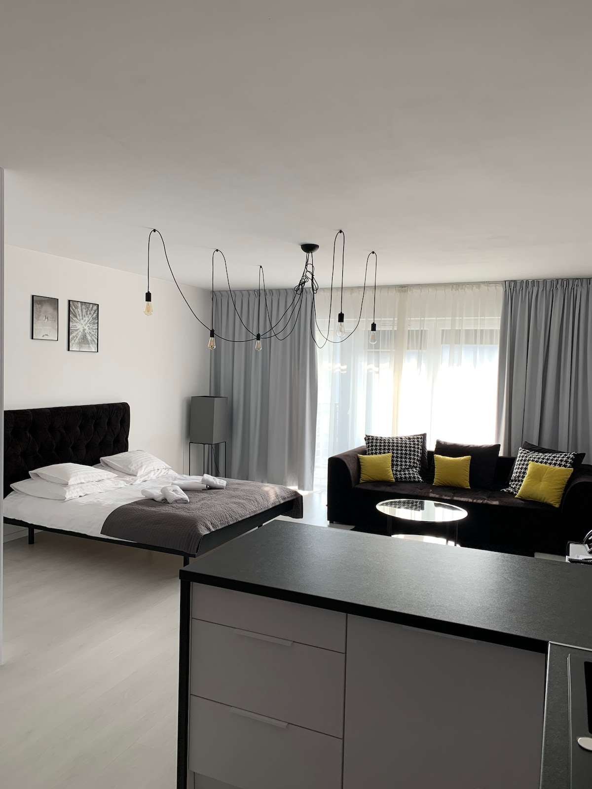 Apartament jednopokojowy z wydzieloną częścią sypialną o powierzchni 38 m² posiada 4 miejsca noclegowe, 2 w wydzielonej części sypialnej, 2 w salonie na rozkładanej kanapie, w pełni wyposażona kuchnia, łazienka z prysznicem. Apartament położony na drugim piętrze od strony ul. Minimalnej. Układ pokoi: salon z rozkładaną kanapą i wydzieloną częścią sypialną oraz jadalnią dla 4 osób, kuchnia otwarta na salon z dwoma miejscami do jedzenia, łazienka z prysznicem, balkon prosty o powierzchni 8 m².