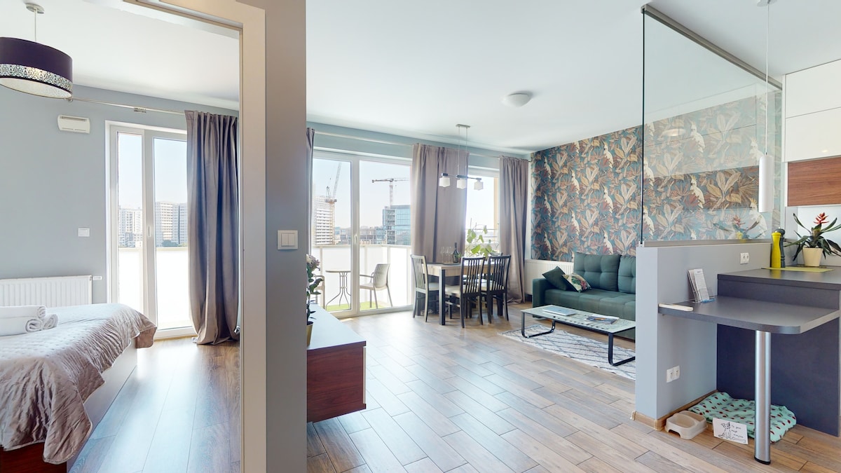 Luxury apartment with two separate bedrooms, a spacious living room, and a large balcony overlooking the Oder River. A fully equipped kitchenette, sofa bed, SMART TV, and elegant bathroom ensure a comfortable stay. Located in the center of Wrocław, close to public transport, cafés, and restaurants, it allows you to enjoy the very best the city has to offer.
