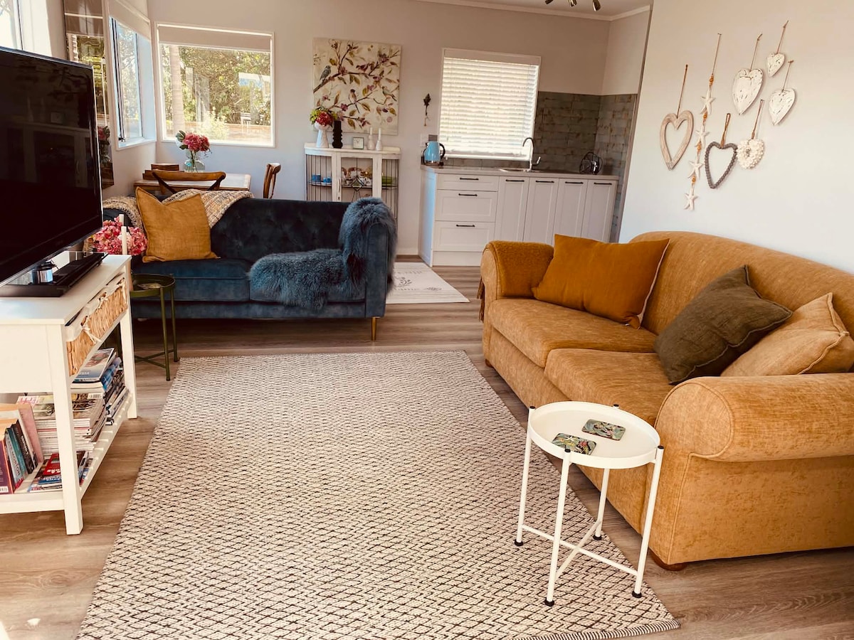 Welcome to my secluded, peaceful hideaway. The studio is a large open plan space. Large sliding doors completely open up the front of the building onto the deck, giving you a feeling of always being close to nature. Surrounded by trees, orchard, lawn and garden, the studio is a quiet retreat space. The sound of the sea and bird song are always in the background. The best beach in NZ is a 15 minute walk away!