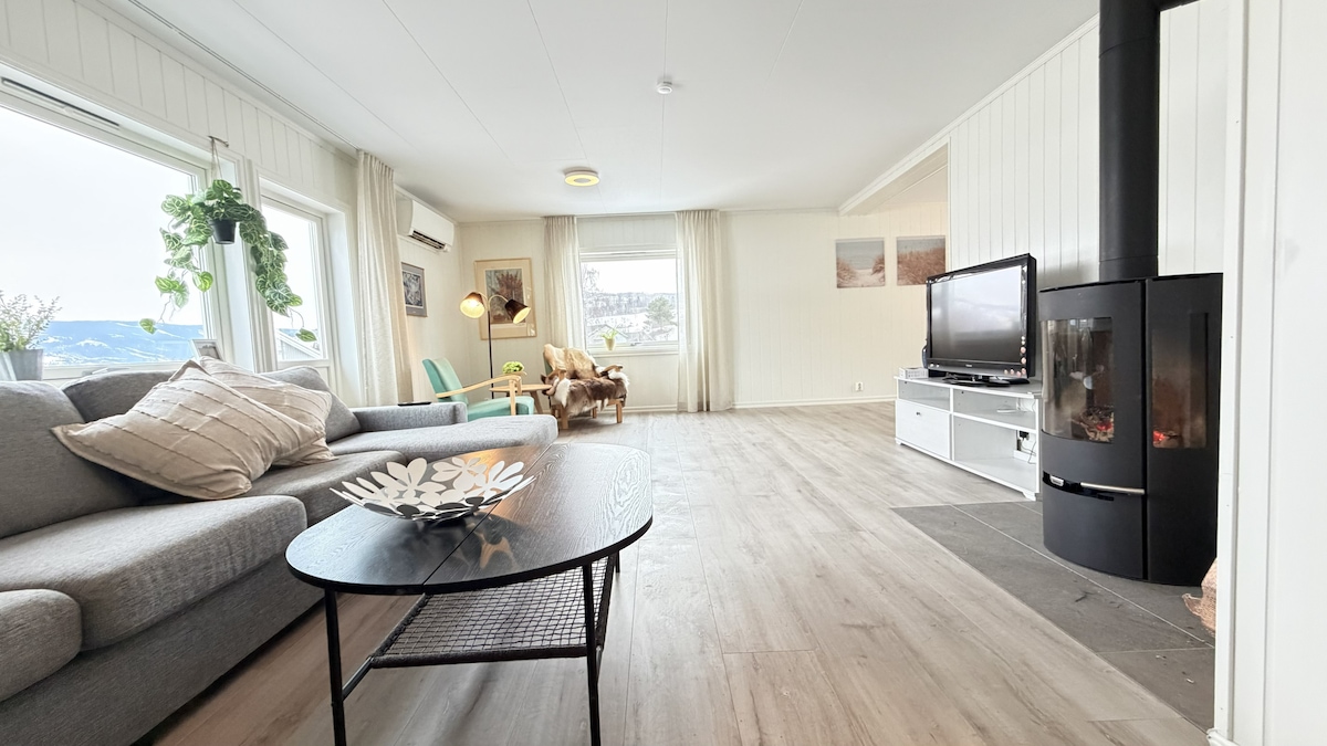 Cozy cabin with panoramic view over Gudbrandsdalen. Open-plan kitchen, dining and living room with fireplace, TV and WiFi. 4 bedrooms and 1 bathroom + separate toilet. Outdoor wood-fired sauna and covered seating area. 40 m² terrace with optional Jacuzzi. Large plot with parking and no close neighbours. Short walk to the ski slope (500 m). Kvitfjell Station 1 km and Olympic Express lift 1 km. Electricity included. Easy train access.