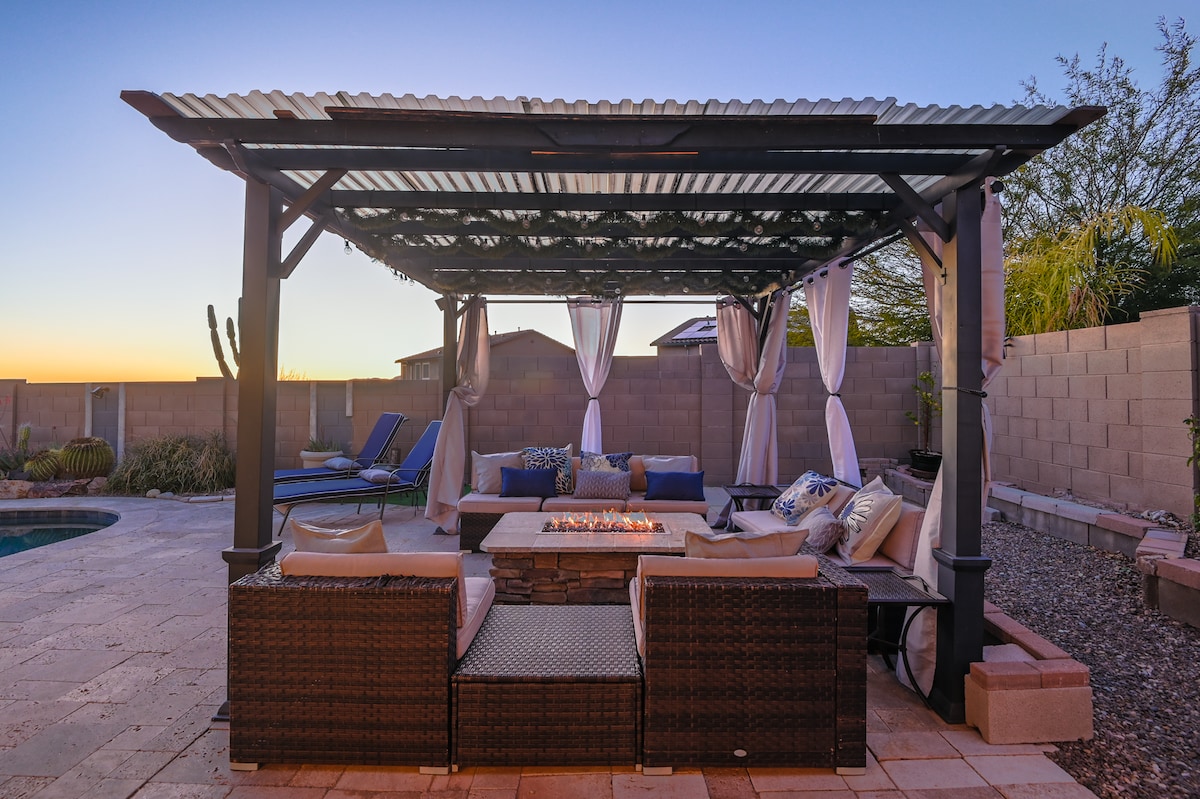 Relaxing, open floor plan! Handcrafted Arizona sunset flag art. Spacious kitchen with nook and unique coffee bar, plus additional dining table in front room. Two king bedrooms, a queen, a bunk room for three, a pull-out, air mattress and a pack & play for the baby make this house perfect for families and friends! The kids will love the Legos, board games, and pool toys! Stroll the spacious backyard, splash in the pool, walk the trail. You'll be glad you came! AZ TPT#21396371 OV STR#00062