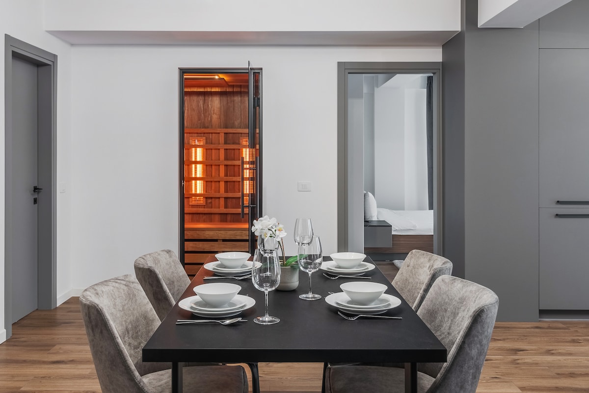 Răsfață-te într-un refugiu urban de lux, dotat cu saună privată și șemineu, la doar 5 minute de mers pe jos (350m) de Piața Unirii. Acest apartament cu 2 dormitoare și 2 băi este conceput pentru relaxare totală, oferind spații generoase și finisaje premium. • Saună privată & Șemineu (pentru seri magice) • Două balcoane mari • Parcare subterană inclusă (acces securizat) • Spații de depozitare generoase • Două băi moderne (una cu cadă) • Self Check-in & Wi-Fi de mare viteză.