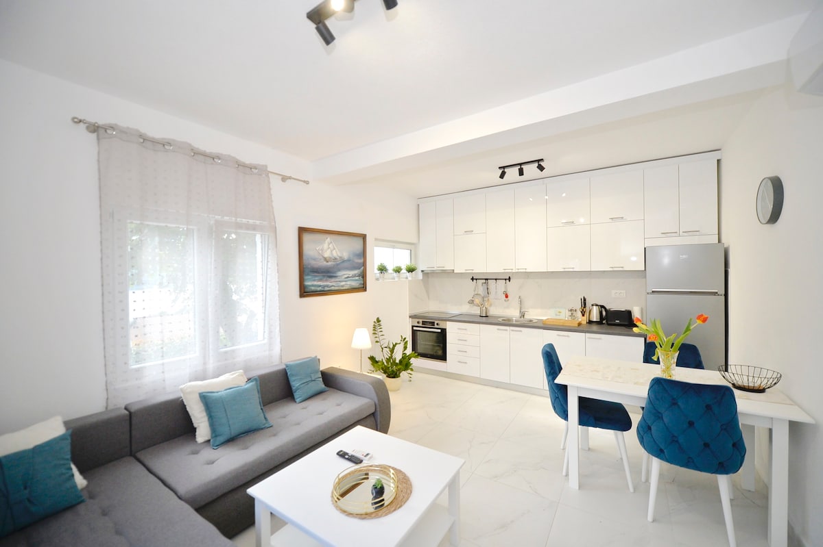 Relax in a new stylish apartment just 300 meters from the beach.Surrounded by greenery and sea views, everything you need for a perfect holiday is included – and it’s all yours! 🚲 Explore the bay with free bikes(with helmets and gear),a paddleboard, snorkeling equipment, and more. 🎮 PS4 and a portable Wi-Fi router let you stay connected and entertained wherever you go 🌄In the evening, unwind on the terrace with views of the sea and mountains, listening birds chirping, plan your next adventure