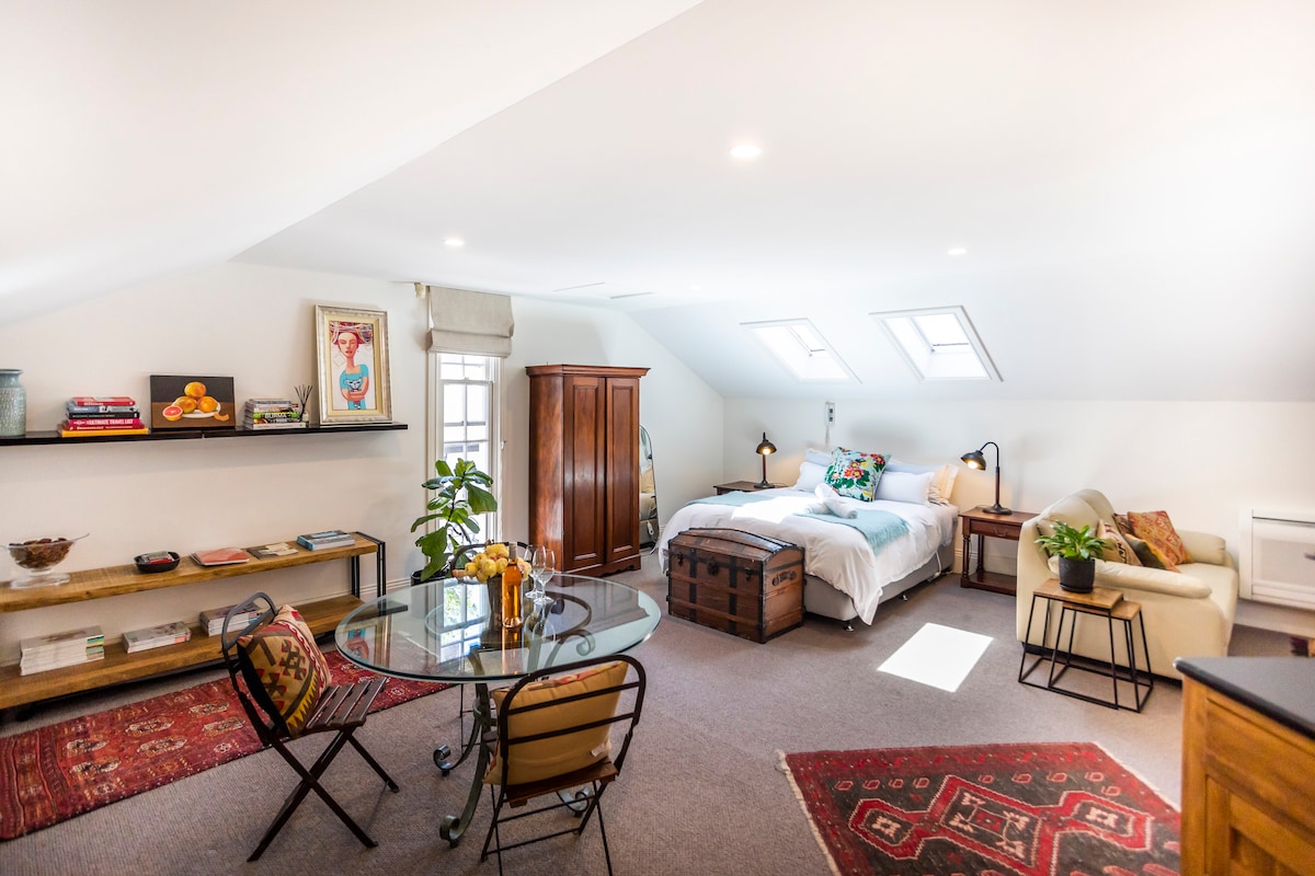 Hawthorn Hill. Stylish self contained studio situated on a 10 acre hobby farm surrounded by rural splendour. Sweeping views over Cowriga Creek & towards Mt Canobolas and Mt Macquarie. Beautiful King bed (twin singles available on request) Full gourmet kitchen & bathroom. Full breakfast or hampers supplied. See horses, jersey cows and chickens. Amazing private firepit & outdoor bath. Only minutes to the historic village of Millthorpe & all the restaurants, cafes, cellar doors & boutique shops.