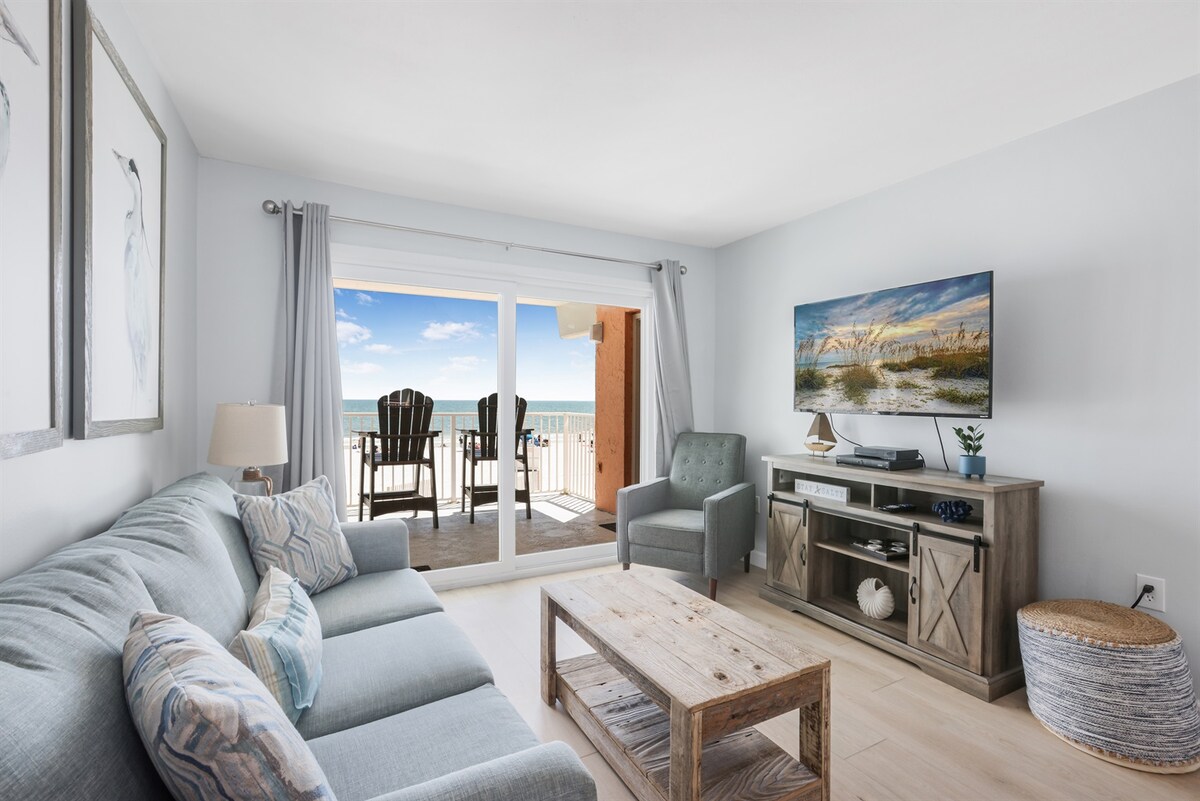 You'll love the DIRECT GULF FRONT view of the beach from the private balcony of this studio! Enjoy a cup of coffee or late night drinks listening to the sound of the waves. Just steps from the sandy white beaches and the clear emerald waters. Newer furnishings and whole unit freshly painted. New dishwasher and counters, ductless AC, queen sized bed and full size pull out sofa, remodeled bathroom with walk-in shower, large flat screen TV, updated full kitchen, washer/dryer in unit and Free WiFi.