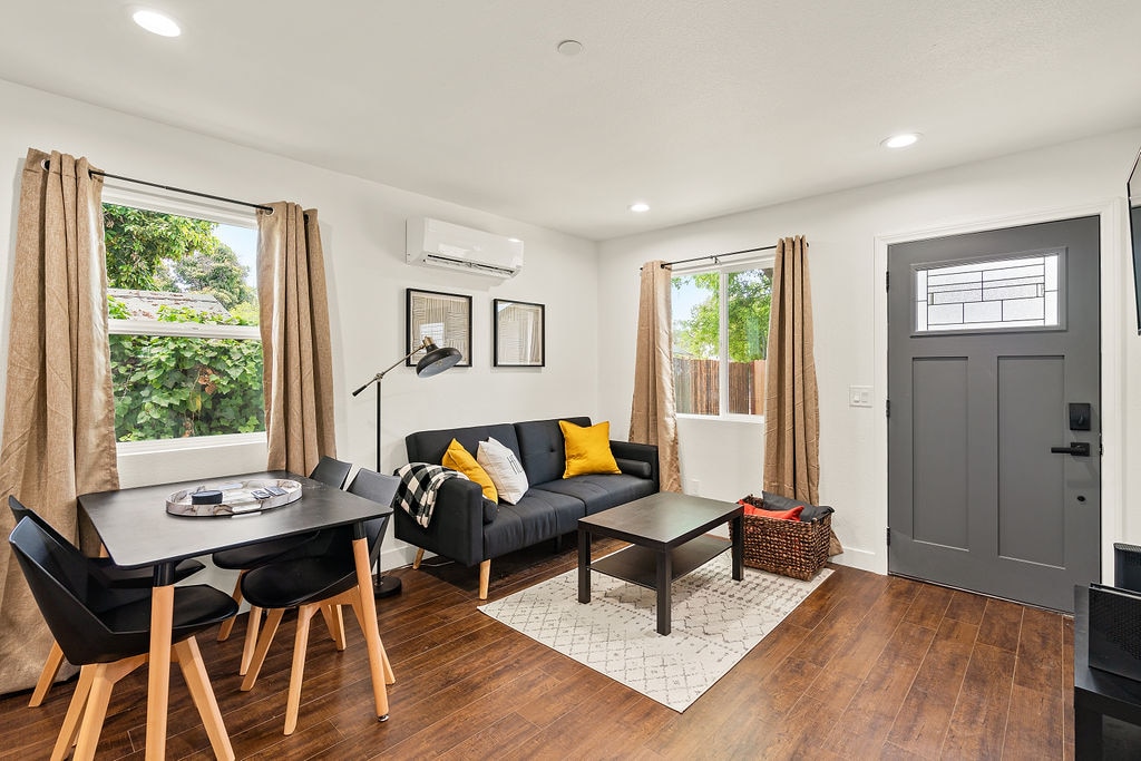 New construction 2 Bed 1 Bath Modern Hidden Gem! This Guesthouse has its own private yard, entrance & driveway. At just under 600sqft, No stone was left un-turned when Designing this space. This open concept Home features a living area with a Sleeper Sofa, 50" Roku TV, 4 chair dining table, A Remote controlled AC & Heat system. Full Kitchen with Microwave, Oven, Fridge & Washer/Dryer. Full Bathroom with Tub & Shower. 2 bedrooms, 1 with a queen bed & the other w 2 twin beds.
