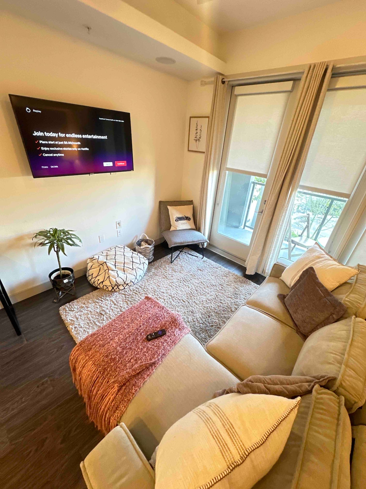 Nothing less than a SPECTACULAR, private, serene apartment HOME. KING Bed. Sleeps 2 comfortably. Sleeping in couch is optional. Full shower/tub. Approximately 725 sq. ft. A 65” Smart TV in the living room. In unit Washer/Dryer (detergent). Full kitchen with everything you need for a short or long stay. Refrigerator with ice maker. FAST WiFi. Shared pool, jacuzzi and gym. Completely sanitized and clean. One assigned parking space. Please come in peace or don’t come at all. Enjoy