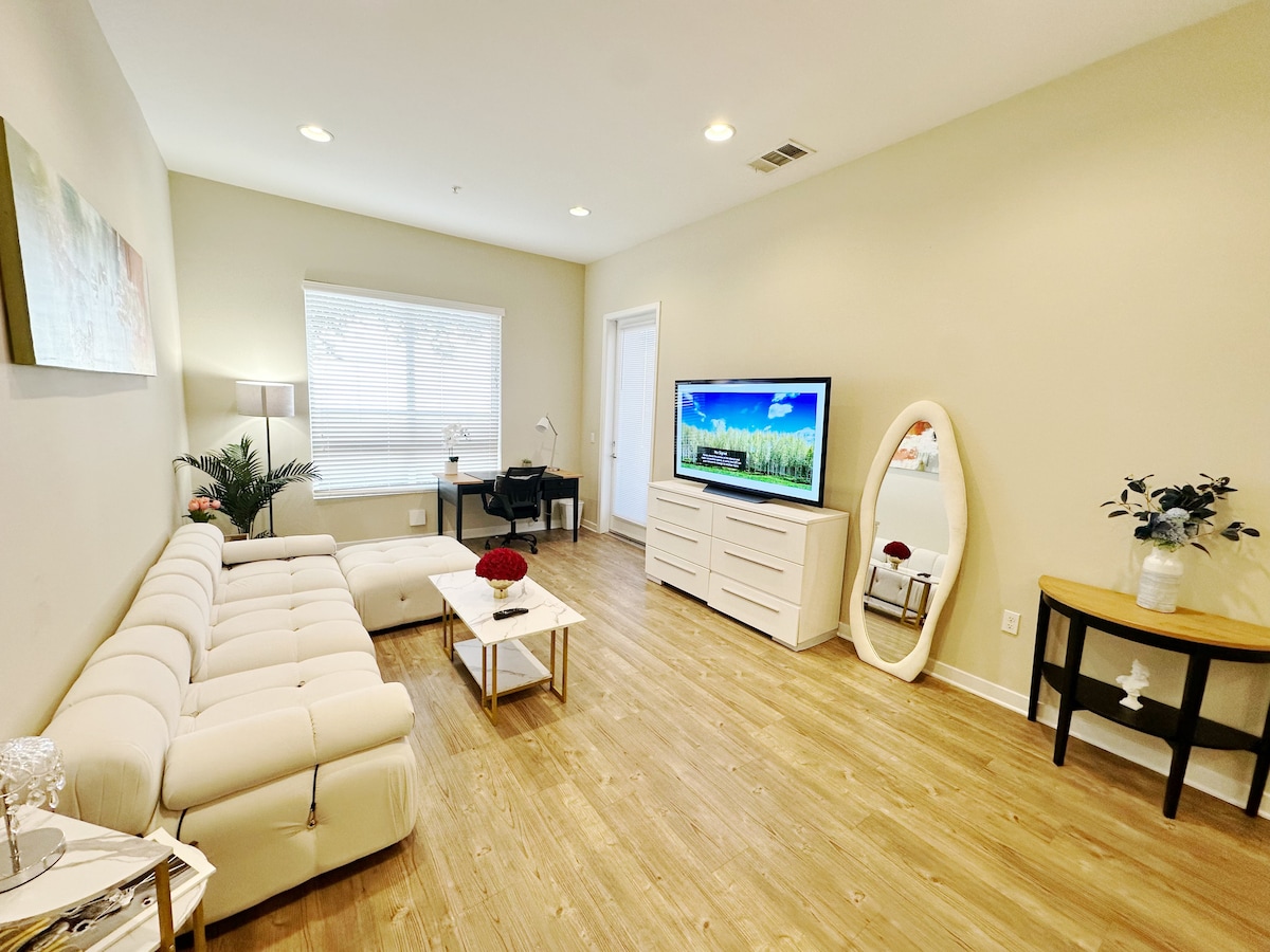 Nothing less than a SPECTACULAR, private, serene apartment HOME. KING Bed. Sleeps 2 comfortably. Sleeping in couch is optional. Full shower/tub. Approximately 725 sq. ft. A 65” Smart TV in the living room. In unit Washer/Dryer (detergent). Full kitchen with everything you need for a short or long stay. Refrigerator with ice maker. FAST WiFi. Shared pool, jacuzzi and gym. Completely sanitized and clean. One assigned parking space. Please come in peace or don’t come at all. Enjoy
