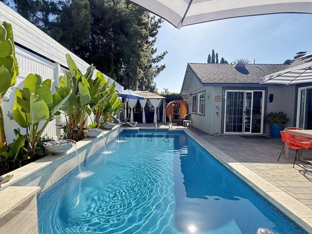 Welcome to Chuchu’s Luxury Retreat! This entire home is surrounded by beautiful water views: a stunning private pool with waterfall, rejuvenating sauna, hot SPA jacuzzi, peaceful koi pond, flowing rock river, and lovely water fountains in the backyard , we also have big games room . Just a 5-minute drive to Irvine Spectrum shopping center , and only 7 miles to get breathtaking Laguna Beach. The home features 3 bedrooms, each with direct access to the pool area. Enjoying your perfect getaway! 😊