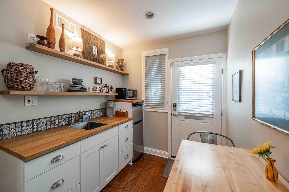 Large 1 bedroom, 1 bath with kitchenette, living room and French doors opening out onto a beautiful front porch for drinks and dining. Watch the world go by in this quiet, neighborhood setting. Wooden floors, custom cabinets, contemporary Med feel peppered with antiques. Walk to Chapman University in 5 minutes, another 10 to Orange Plaza's great restaurants. Disneyland is 4 miles away. The Honda Center and Angels Stadium are 2 miles close. Beaches within 10 miles. Guests exclaim, "Wow!"