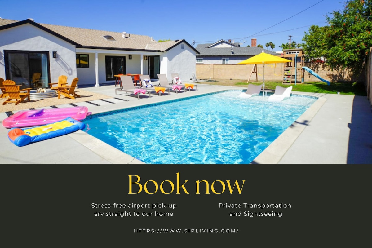 Art-filled retreat with unique artifacts, a lush garden with vibrant plants and vegetation, small pond, private pool & spa, firepit, and outdoor kitchen. Relax in a quiet cul-de-sac with two shaded patios, modern entertainment including streaming TVs, surround sound, a small pool table, and an Xbox. Ideal for families, friends, couples, or business travelers seeking comfort, privacy, and a memorable Southern California stay near Disneyland and major attractions.