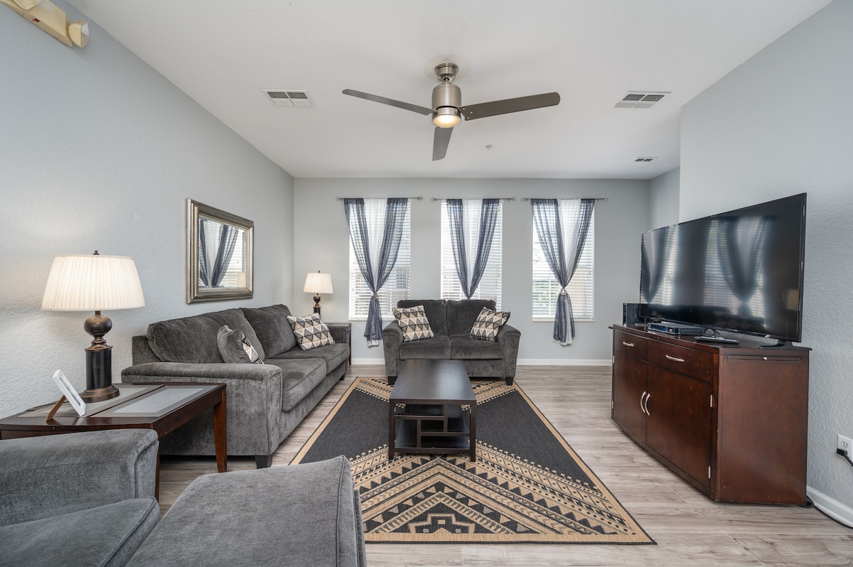 Beautiful updated 3bedroom 2 full bathrooms, sleeps 8; only 200 ft from club house. Located near Universal Studios, Sea World and within walking distance to Orange County convention center and International Drive. For your convenience we offer valet wagon for those heavy bags and electronic door lock for easy access. Our club house has a large hot tub, 2 pools ( 1 large adult and 1 large children's pool ), pools are heated during winter, poolside tiki bar, fitness room, gated community .