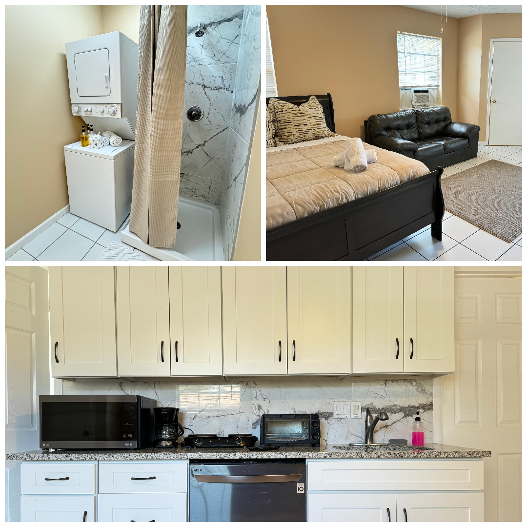 Private Queen studio with private equipped kitchen, private bathroom and Private Entrance. It has a Queen size bed, and a comfortable large couch that sleeps one. Suitable for adults or children with extra linens, blankets and pillows provided by the Host. Flat Screen smart TV. Disney World is 10 miles or less than 5 minutes walk from Universal Studios. The best and convenient studio totally remodeled. Everything is new. Linens and towels are provided at the start of your stay.