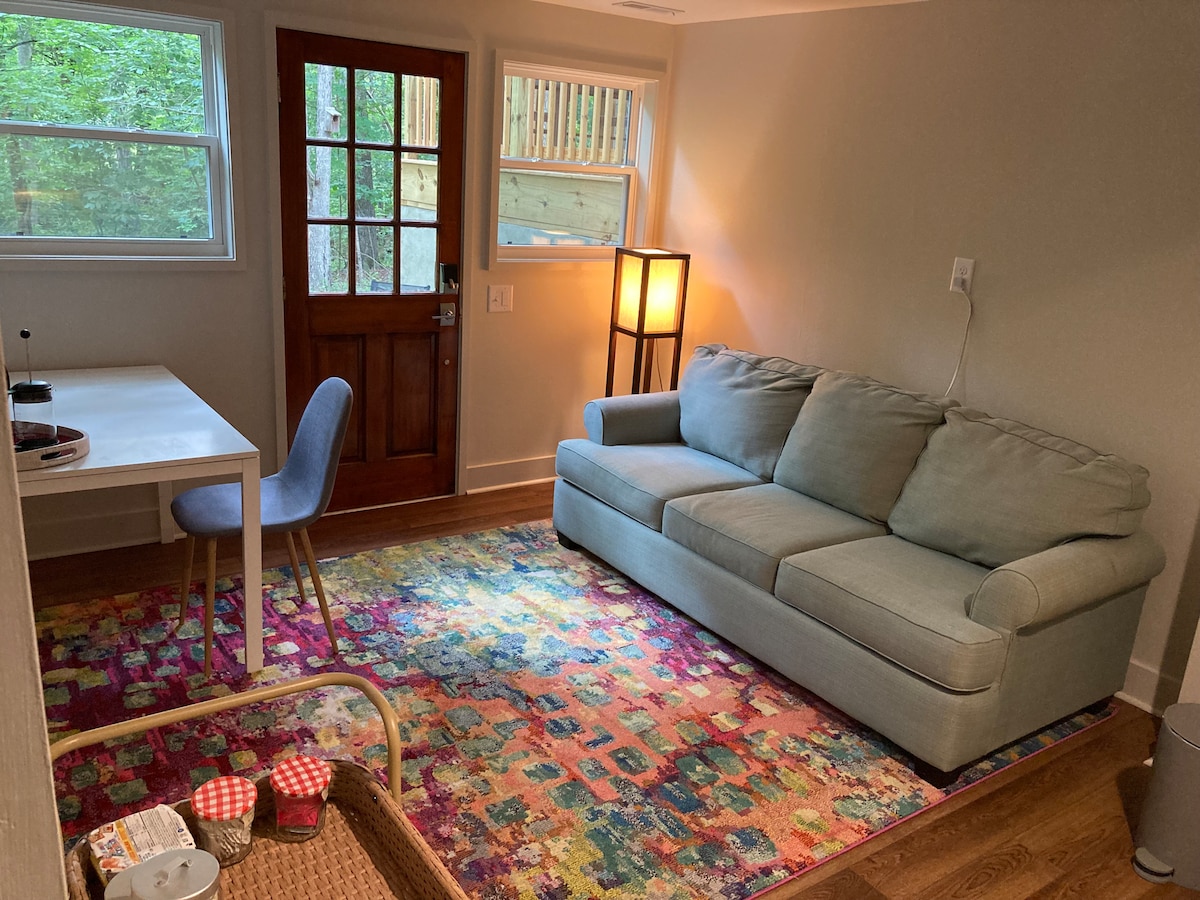 Stay in our cozy 1BR apartment on the first floor of our split-level home in Carrboro, NC! The apartment is within walking distance to Carrboro town commons, Weaver Street Market, and the (free!) Chapel Hill bus system NOTE: There is sound proofing! But, the apt is on the first floor of our family home, so some "sounds of life" from the main house may be heard (e.g., the buzzer from the laundry, garage opening/closing)