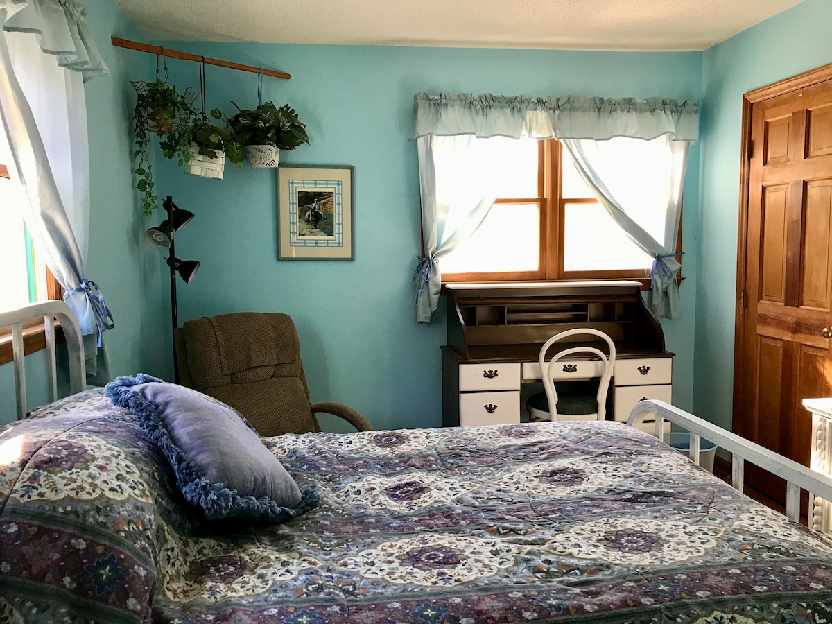 Our home has two upstairs bedrooms, Blue and Red, with a shared bathroom. Currently only the Blue bedroom is available. We're a 10-acre farm surrounded by woods, about a fifteen minute drive to Chapel Hill. My husband and I live on the lower floor, and our daughter lives in the Red bedroom. We work in the fields and forest just outside the door. Standard fee covers two guests with three-day minimum stay.