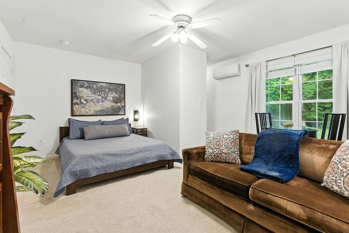 This stylish studio is a 5 min drive to downtown Carrboro and Chapel Hill. Weatherhill Townhomes are secluded and have easy parking. There is a king-sized bed for maximum comfort, and the couch can sleep one additional guest if needed. Enjoy the kitchen and having a bathroom all to yourself! This private basement unit overlooks the forest, which provides a lovely view any time of year. To that end, remember to bring a laptop if you want screen time (no tv here, but there is private internet!).