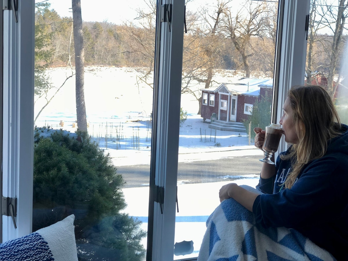 Take it easy at this unique and tranquil getaway. I look forward to hosting you. Enjoy a private room with a queen size bed and a large screen smart tv. The full bathroom is located across the hallway. Enjoy a warm fire in the sitting area. There is a work area and a high table to enjoy some tea/coffee or wine with dinner while enjoying the view of the Hudson through the large windows and sliding door. We have added a separate kitchenette additional crockpot and induction cooktop.