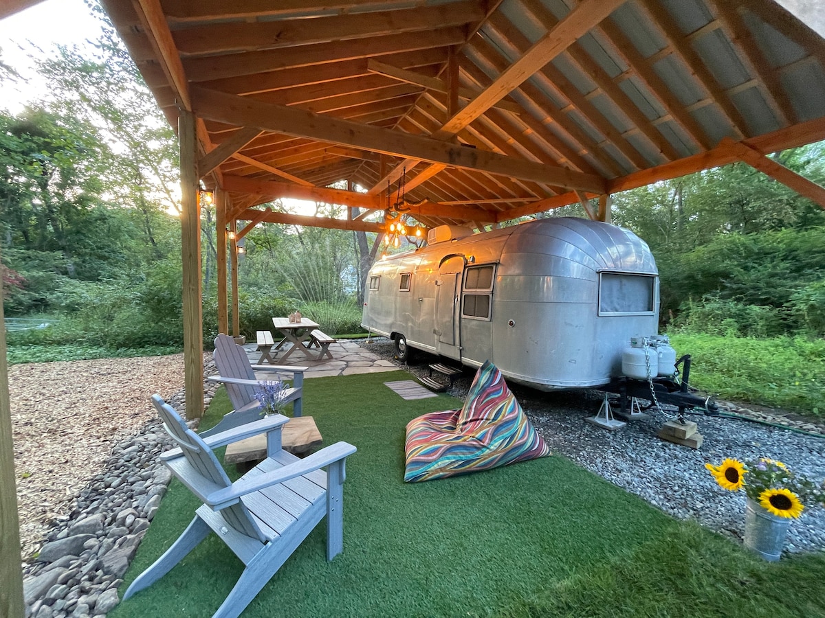 This memorable place is anything but ordinary. 2013 31’ Airstream with full kitchen and close to EVERYTHING! Can be combined with our Hudson Valley Loft listing for a larger group traveling together. The Airstream is nestled back in a wooded part of the property on over an acre. It has a covered canopy over the whole camper. You’ll feel like you’re camping in the woods while being around the corner from all the conveniences! It lives like a TINY HOUSE! Connected to water, electric and sewer.
