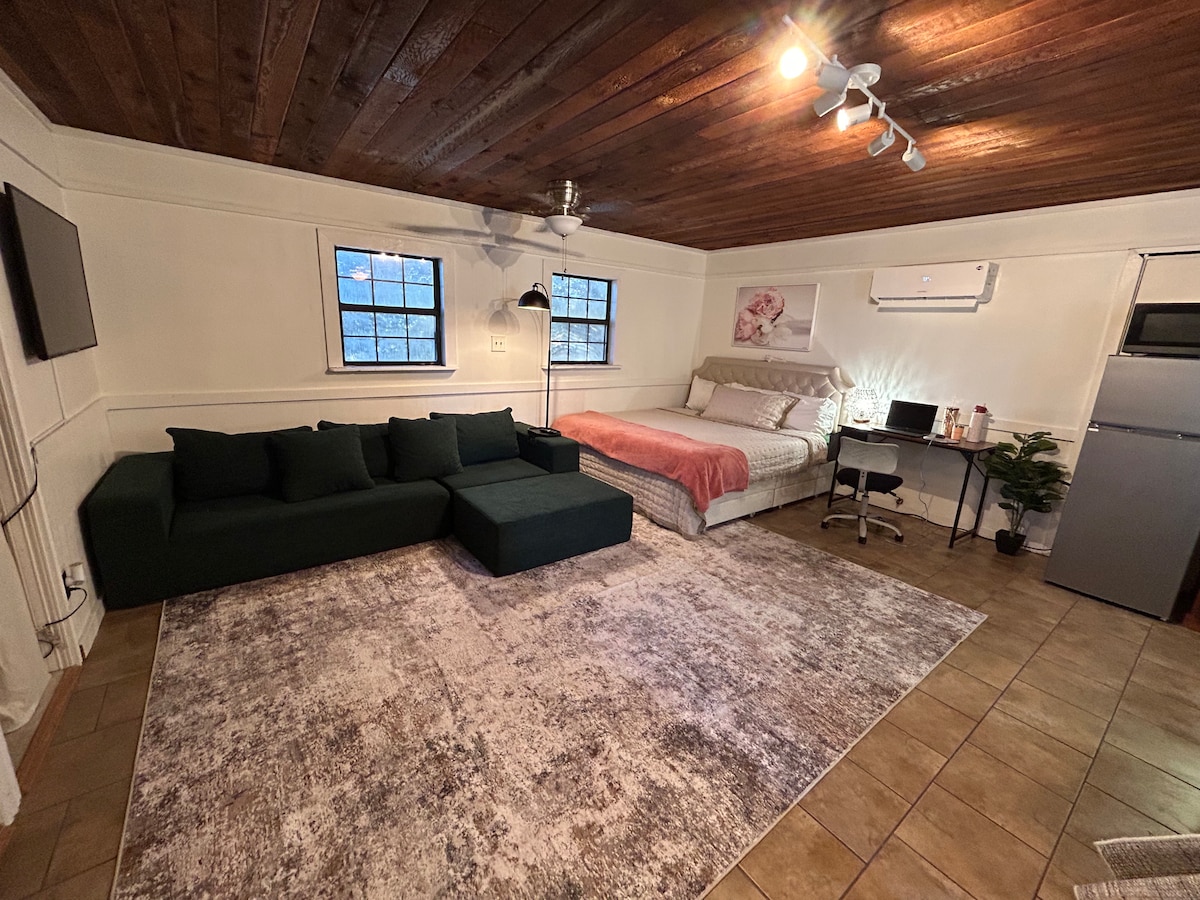Entire extra large studio-style guesthouse above separate 2 car garage unit. Equipped with new king bed w/ storage underneath, comfy sectional style sofa, full kitchen and island area for cooking ease. Bathroom is a stand up shower and plenty of storage nooks. Wall mounted smart TV as well as ability for complete blackout via the shades. Outdoors, there is a nice area to enjoy a fire with family/friends.