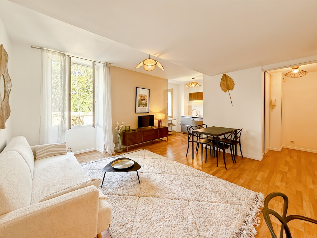 Appartement d'architecte luxueux design et unique, parking, dans un bâti haussmanien de charme, climatisation réversible gainable et literie haut de gamme confortable, tout équipé avec jardinet de 30m2. Idéalement situé au calme absolu, visitez la ville à pied : 4 minutes de la gare TGV et des arènes romaines, des monuments romains, profitez de la douceur de vivre du Sud et des chants d'oiseaux en étant proche de tout: cafés, terrasses, boutiques, musées... Tout à été pensé pour votre confort
