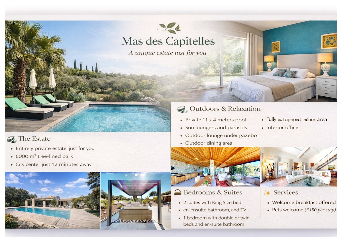 Elegant family villa in Orange with private, non-overlooked pool and shaded terrace. Sleeps 8: two twin bedrooms (4 singles), one master (double), plus an independent studio with double bed and private bathroom. Quiet area, 5 min by car / 20 min on foot from the Ancient Theatre; near Châteauneuf-du-Pape. Equipped kitchen, A/C, Wi-Fi, washer/dryer, charcoal BBQ. Self check-in via key box (code sent). Check-in 3 pm; early access often possible.