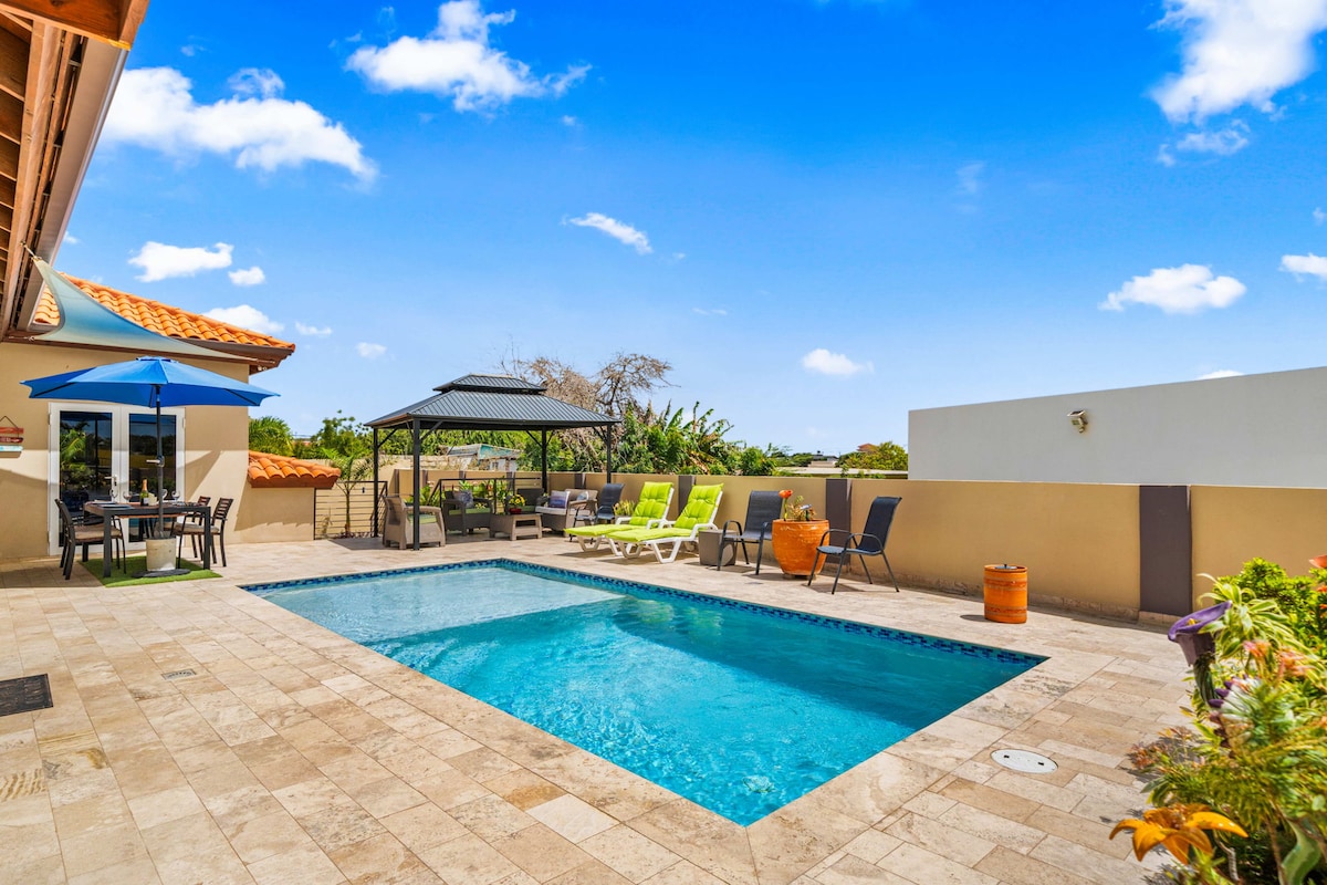Welcome to our Peaceful Oasis, a 5-bedroom, 3-bathroom villa just a 10-minute drive from Eagle and Palm Beach ✔️ Spacious Patio – Large pool, lush garden, sun lounges ✔️ Outdoor Dining – Seating for 12, BBQ Grill, covered Lounge ✔️ Fully Equipped Kitchen – Icemaker, Nespresso, cooktop, airfryer & oven ✔️ 5 Bedrooms – Premium linens, and Smart TVs in each room ✔️ Entertainment – 55” 4K Smart TVs with Prime, Disney+, Netflix ✔️ Beach Essentials – Beach chairs, towels, and cooler provided