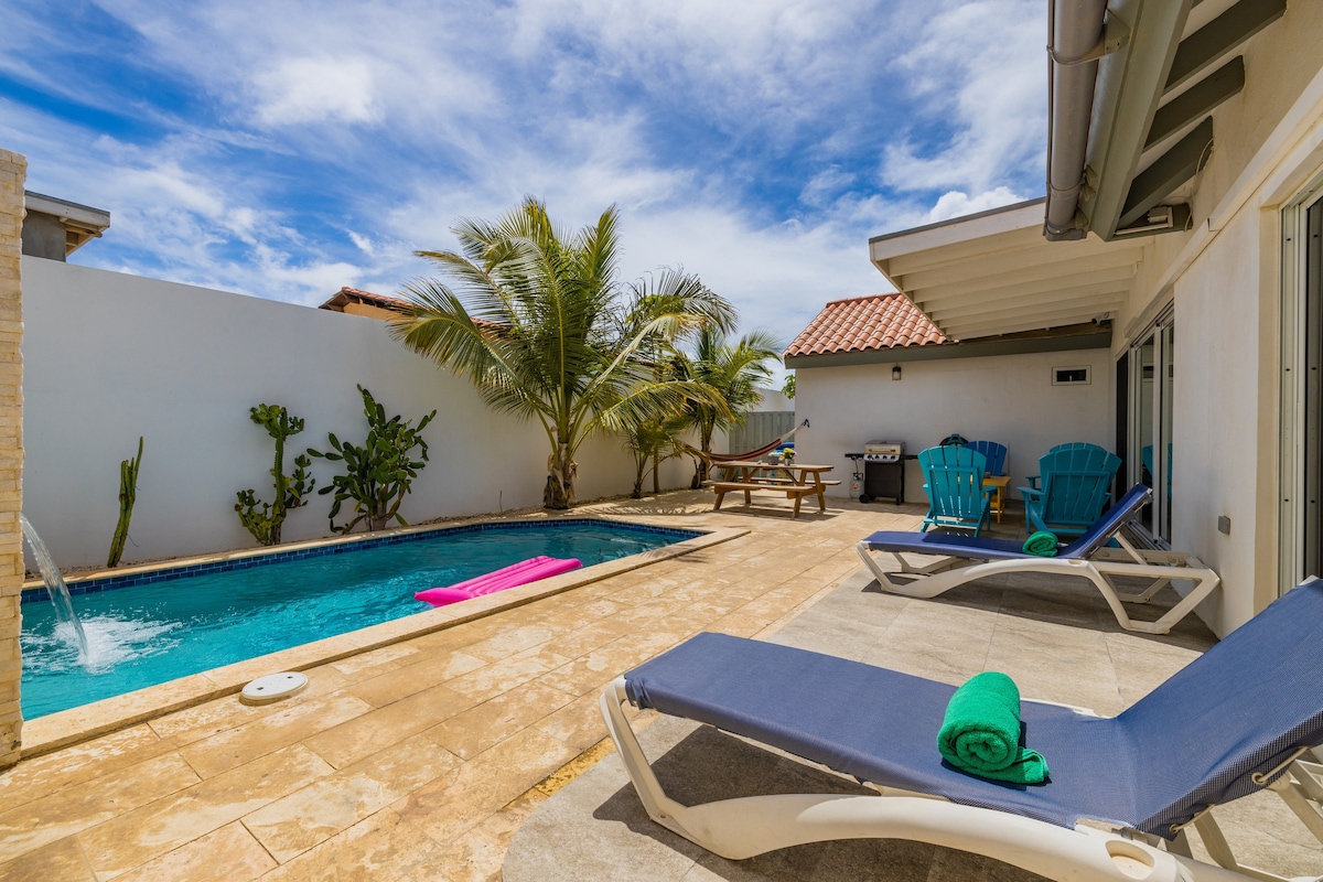 This is a very Cozy, Clean, and Modern place. There is a hot shower. We have a large gazebo with dining table and a grill. It’s located in the middle of the island area Paradera. 7 Minutes from the airport 10 Minutes from Downtown and 12 Minutes from the high rise. There are small supermarkets nearby. We have the option to rent a car with free airport pick up. The place has a beautiful salt water pool with a waterfall that will be cleaned professional twice a week.