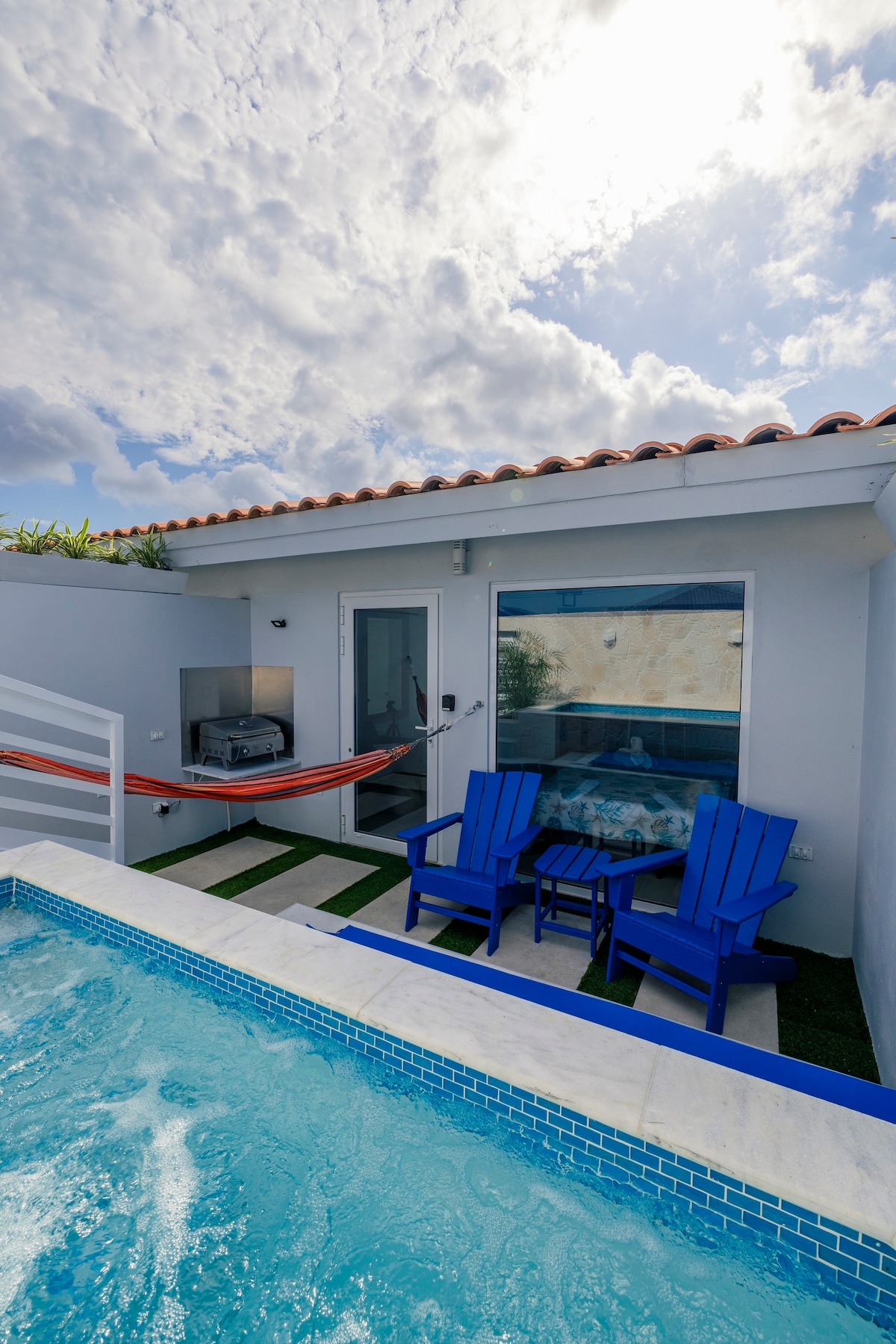 Kick back and relax in this calm, stylish space that is a stone's throw to Eagle Beach! We even have a buggy so you can put your cooler full of goodies, beach chairs, beach towels and go and enjoy a wonderful day at the beach! Happy hour at the beach bar is a must! Relax at home by the pool surrounded by a gorgeous tropical oasis! There is a gym, BBQ and outdoor dining area as well. Personally, enjoying the warm Caribbean breeze on the outdoor couches is our favorite!