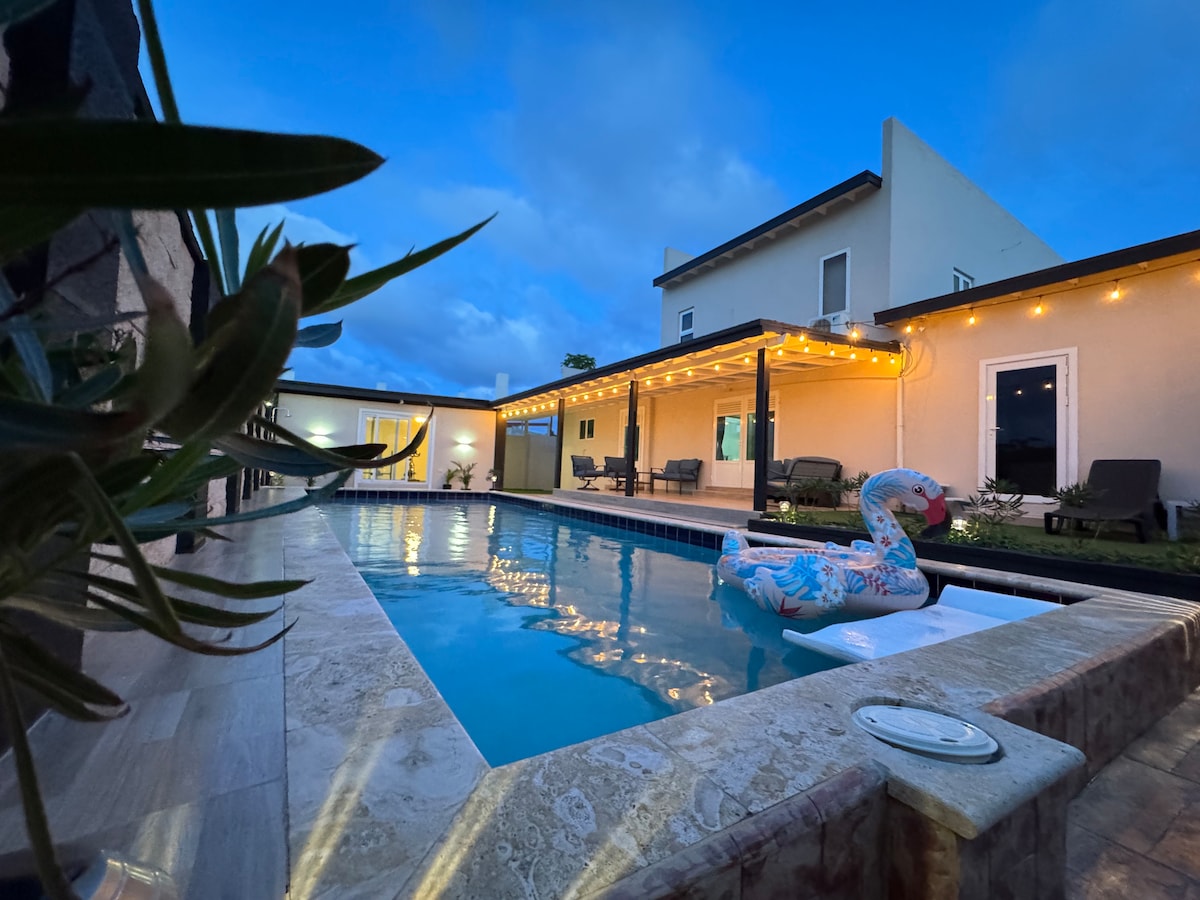 Experience Aruba at this cozy home featuring an extra-large private pool in a tropical garden.The spacious pool area boasts a deck with comfortable lounge chairs, an outdoor patio, with a grill. Enjoy your day by the pool or take a short 15-minute stroll to the nearest beach. Inside, a modern kitchen equipped with all essentials awaits. The entire house is air-conditioned, and the bedrooms are both modern and roomy. Make lasting memories with friends and family at this perfect vacation home.