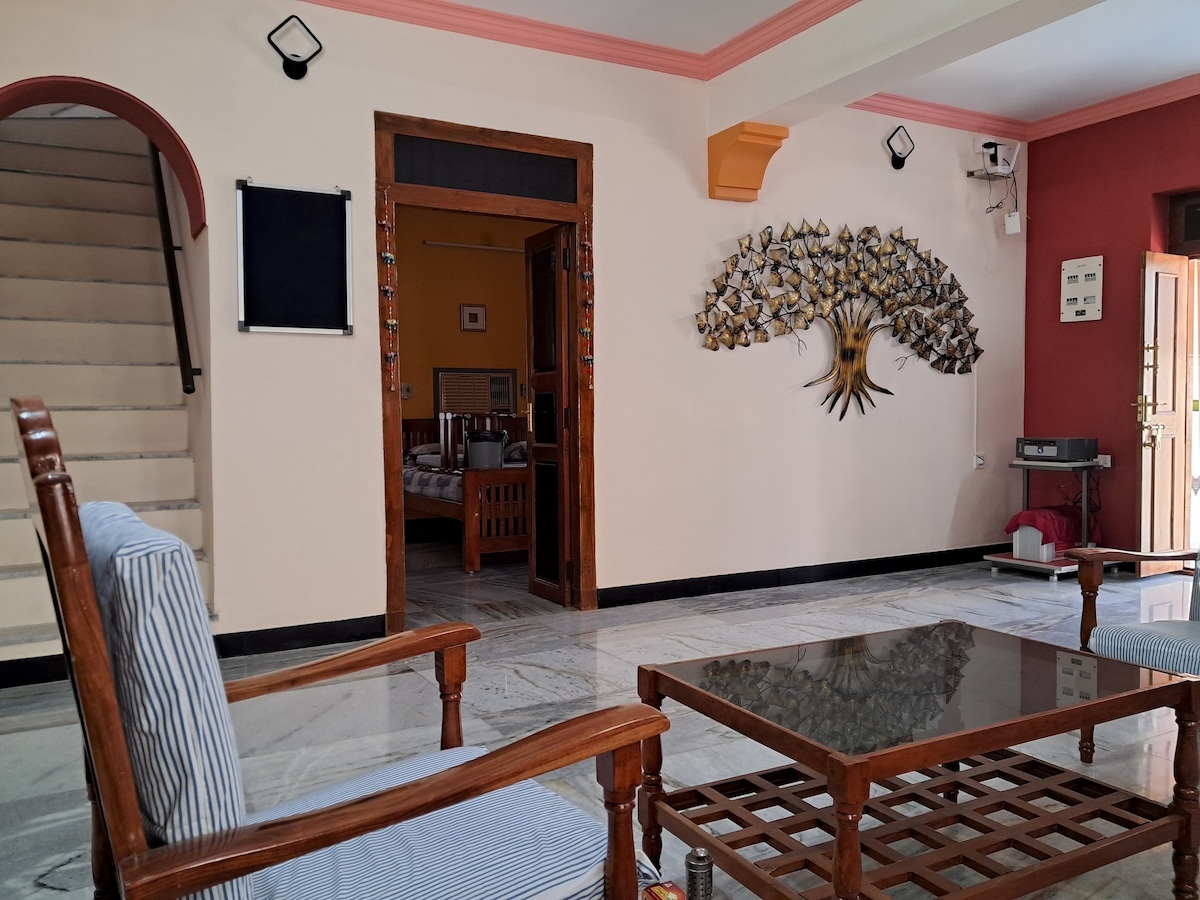 Located at Heart of the City., Brihadeeswarar Temple and Thanjavur Palace is 2 Kms from our homestay. Home Food is available and Best Hotels are near by for Pure VEG and NV. Spacious Living Room, 2 Bedrooms Equipped with AC and both has attached Bathrooms. Extra Bedroom is Available. Seperate Room is available for Driver near by the home with Additional charges. Homestay is Best suitable for Short and Long stays.